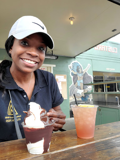 Read moreThe crew was SUPER nice with smiling faces! After a long workday and long week (ok, it's Tuesday but who's counting), I'm glad I stopped by. The smiling faces, shady umbrellas, & awesome misters really relaxed me. They also let me try samples of the custard (bc is it not just soft serve?) and the sangria (bc fruits or it didn't happen) which was so sweet of them! I had the vanilla custard with Mexi hot chocolate sauce and a small sangria. Chocolate sauce was regular. I think they put a dash of cayenne in regular choco sauce. I'm pretty positive the sangria was made with rosè or a blush wine at probably about 9% alc. I'm a mom. That just won't do. BUT everything was still tasty.