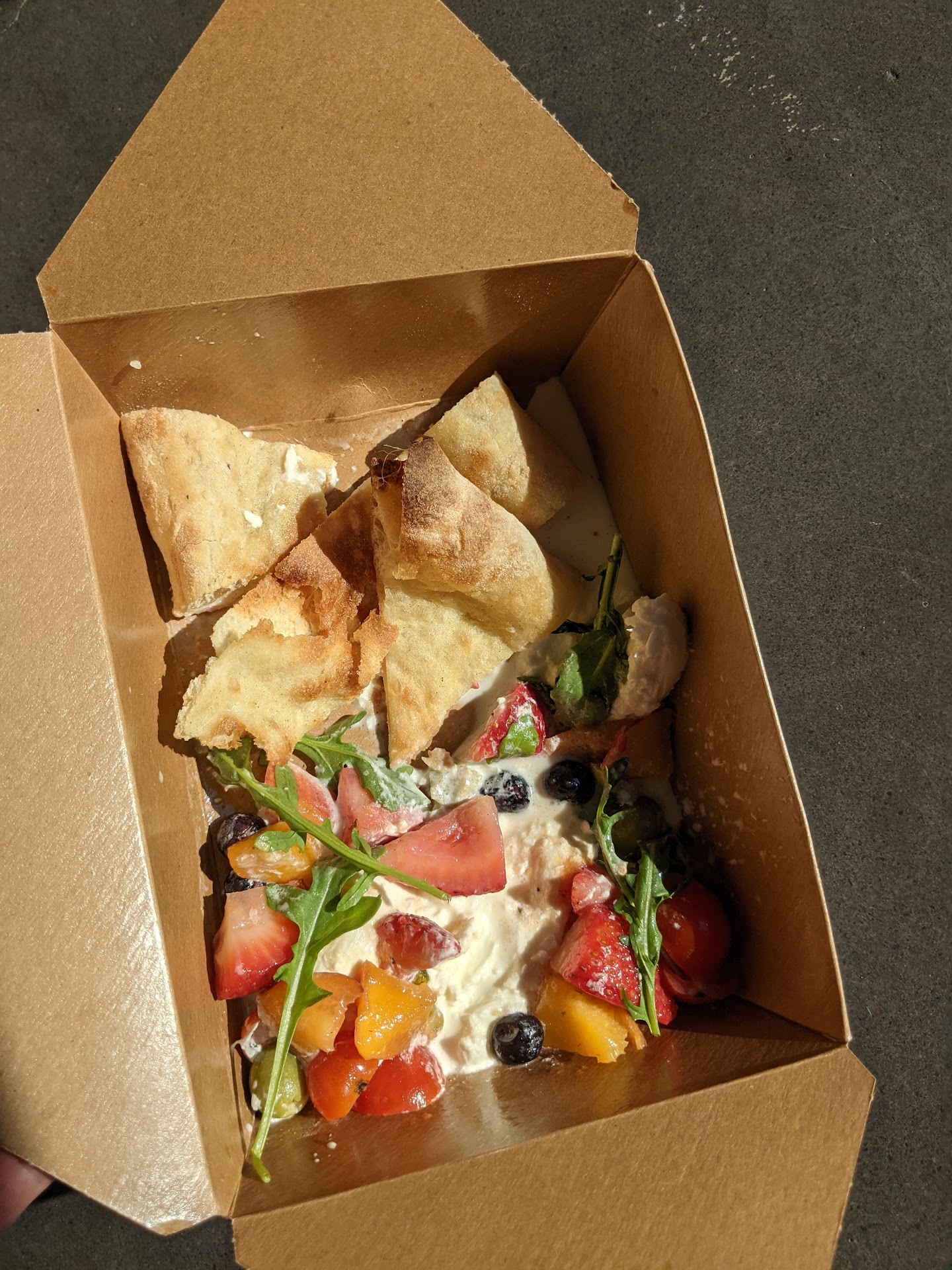 We also ordered the burrata and the carrot salad for take-out and opened the containers within minutes to eat. They're both large enough portions to be a meal, which justifies the price of $14 and $10, respectively. The burrata is bad. It was bland, watery, and felt partially dissolved. The salad on top of the cheese was unseasoned. It's served with plain cooked pie dough, which I makes sense but it'd be nice to have some sort of bread option. The carrot salad came with two dressing: zhoug (a fresh cilantro dressing that was supposed to be spicy but was not) and a sort of honey mustard. The mustard dressing didn't work with the carrots at all. The carrots were colorful and limp with fresh herbs and feta. The flavor was fine but it and the texture would have been much improved with some carmelization on them.