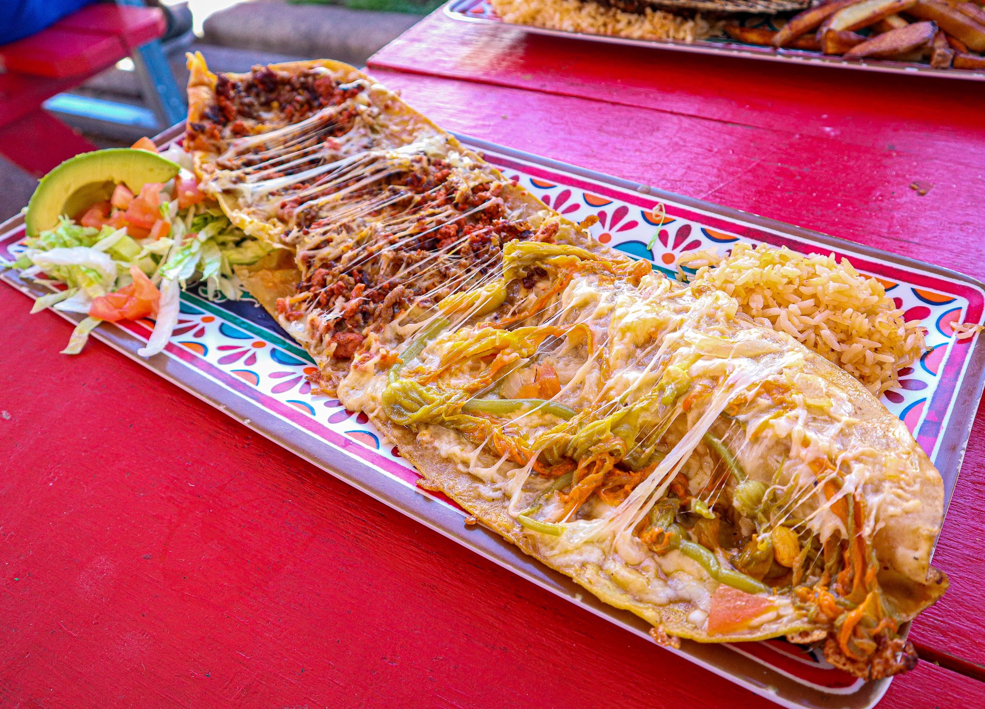 Machete half campechano (beef steak and chorizo) half flor the calabaza (Squash Blossom)- 18 inch long quesadilla made with a handmade tortilla and stuffed with cheese and preferred protein. It comes with rice, beans, salad...