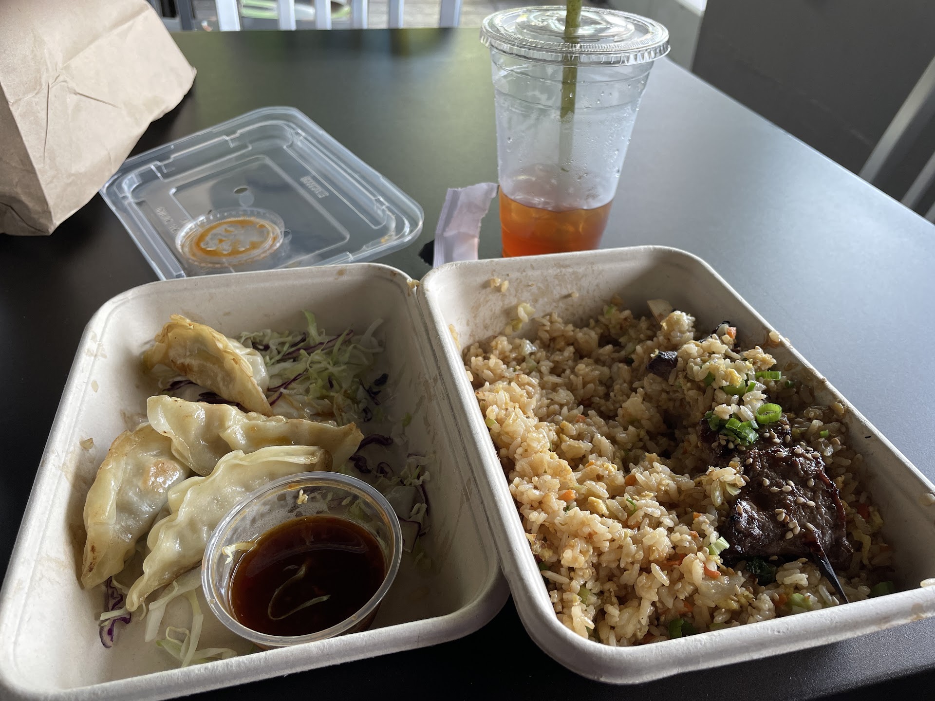 I had the pork potstickers, which are some of the best in town. They're crispy, but not deep fried and the sauce has a good flavor. I also liked my noodles with the beef skewers. The beef was high quality, but it would've benefitted from being flipped on the grill as one side had grill marks and the other side was just grey meat. My dining companion had one of the grilled cheese sandwiches, which she described as good.