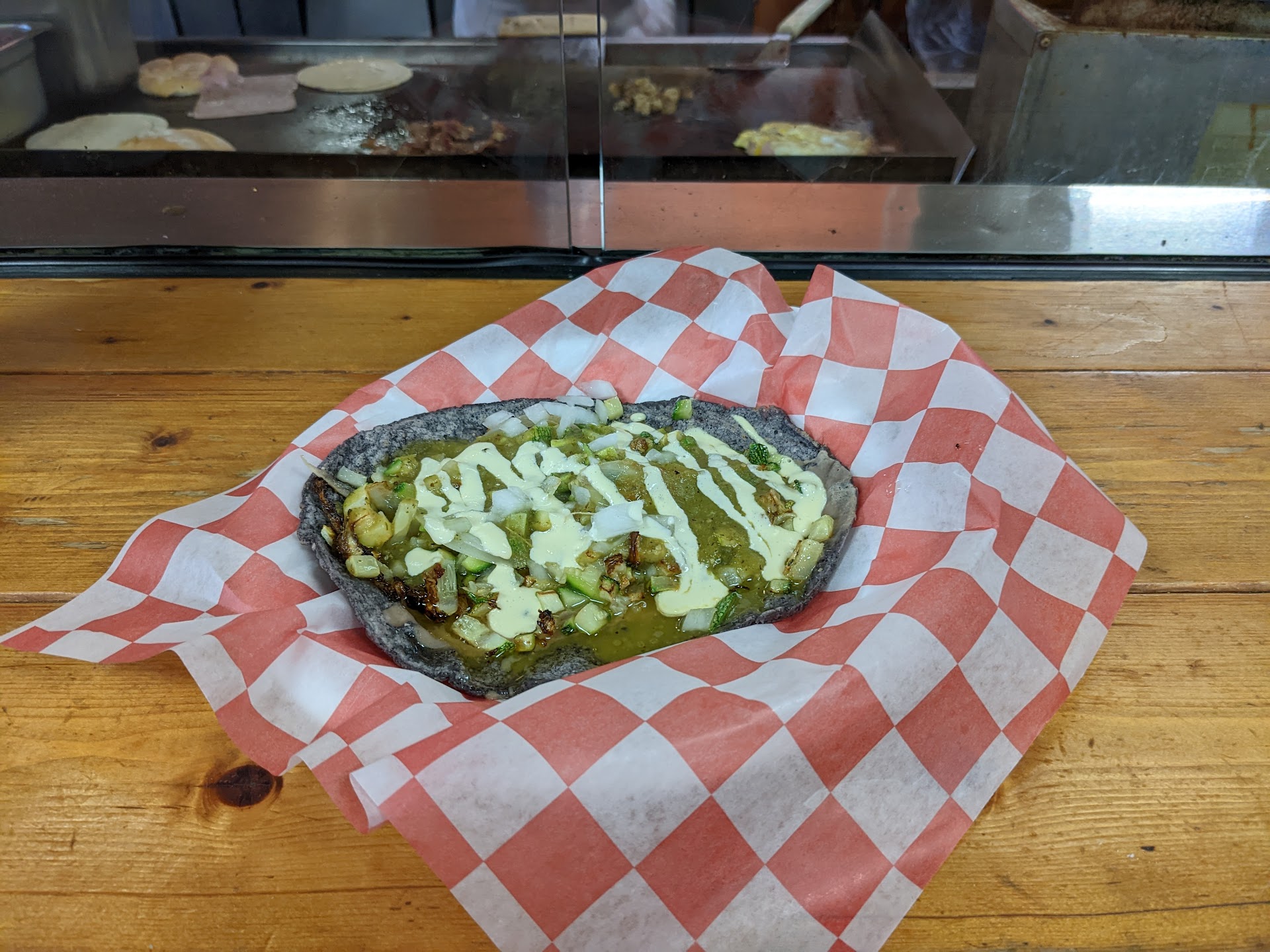 For the Huaraches, you can literally watch them start with the blue corn tortilla dough ... they press that out and toss it on the flat top to cook. While the tortilla is cooking they work on preparring the toppings. We normally enjoy the mushrooms, nopales (cactus), or the squash as we don't eat meat. Everything comes out fresh and matches well with the various aqua frescas that they offer. As with any fresh fruit ... you can taste the different ripeness, sugar, and pulp levels of most of the fruits throughout the year which is fun. If you are new to aqua fresca, try the sandía (watermelon) or the piña-naranja (pineapple-orange) mix. Those two mixed together are great as well.