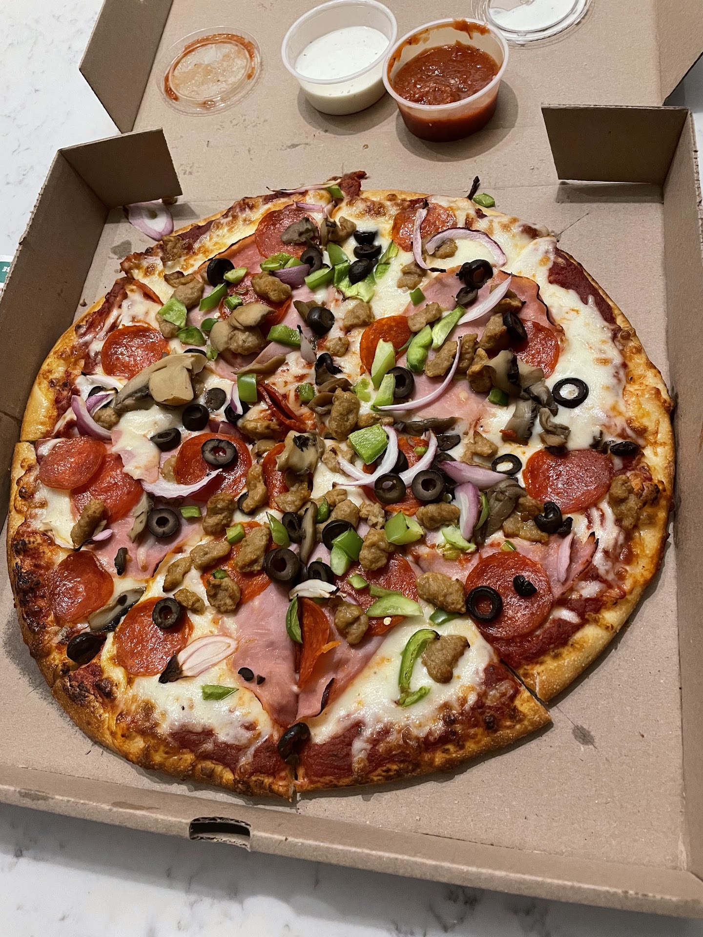 Read moreMy daughter had been wanting to try this place and it is so close to home but was extremely disappointed. The cheese tasted sour and rubberlike. The pepperonis didn't seemed cooked. And my whole family has been constantly needing to RUN to the restroom. If you don't want your stomach to be messed up for days, don't go here! I ordered 2 pizzas, wings, garlic sticks and the wings(these were okay and was the only thing we finished) and we ate a slice each and threw the rest away disappointed and upset I...