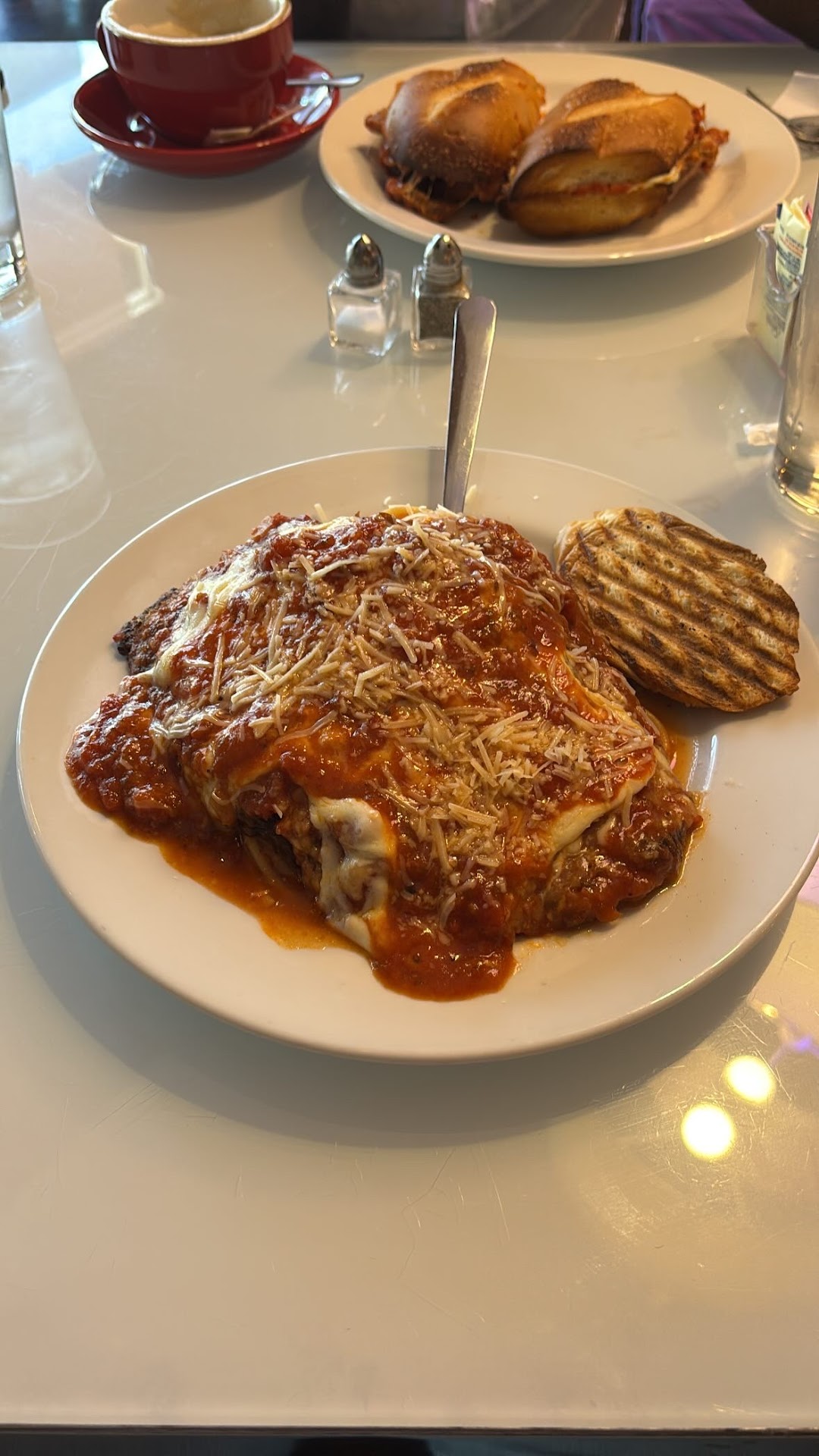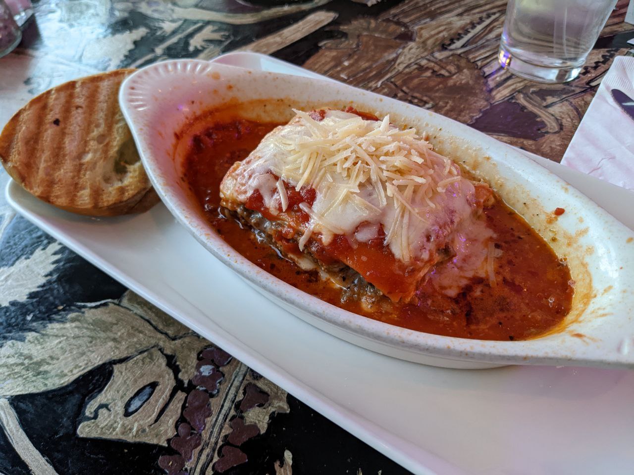 Here is the main goal of this review, service straight sucked bad, the food is not good. Chicken Marsala mushy vegetables, sauces taste horrible and chicken was like cardboard. The eggplant baked was soggy. My mother ordered a salad did not even eat it, why is was old, wilted. This place is over priced. I’m admitting I did not want to even tip the waitress a $7.00 dollar tip on a 112.00 dollar bill. Why she was horrible. I will never eat here again. The food is horrible. Olive Garden- is better...