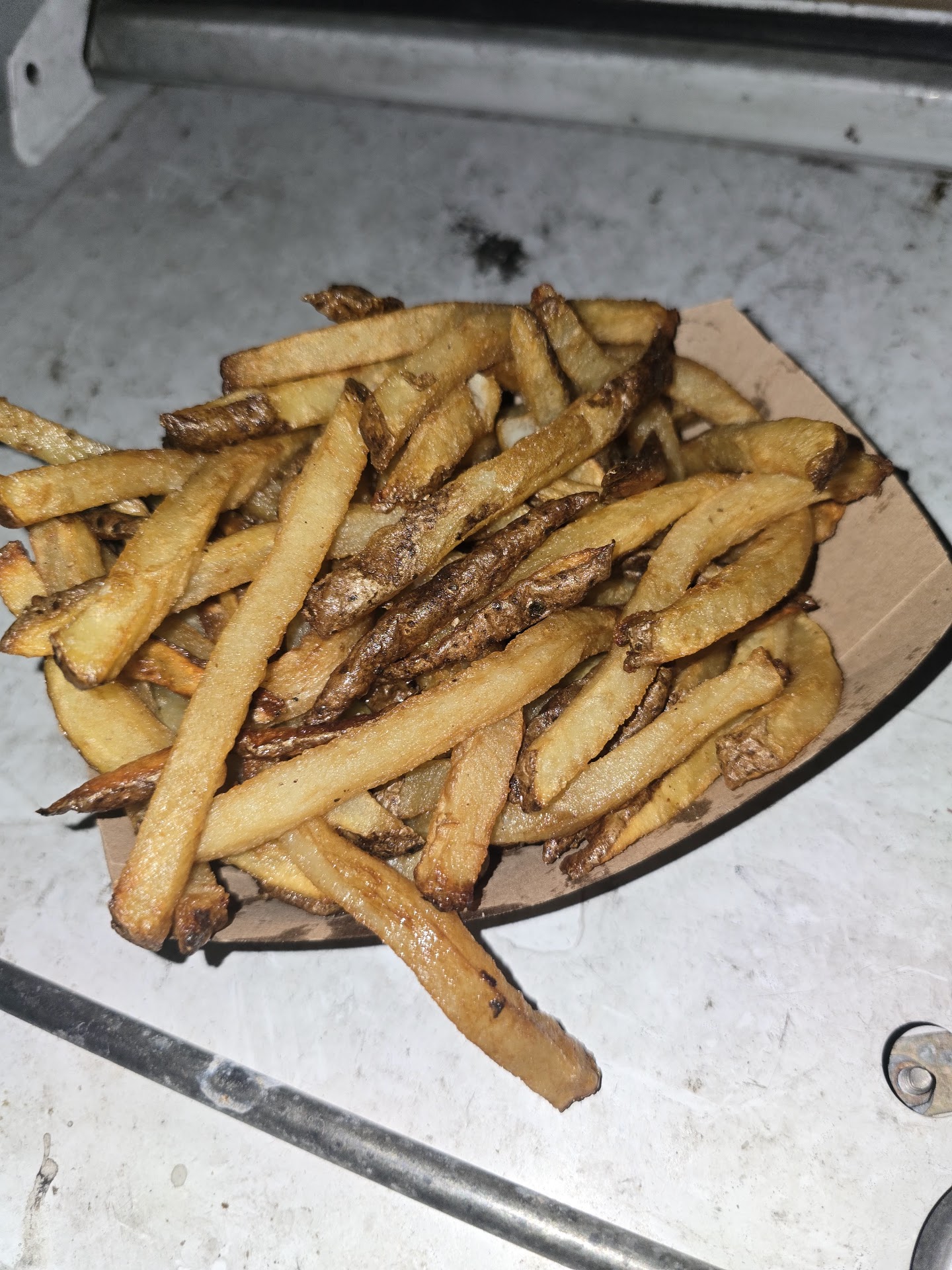 I normally LOVE their fries. They are usually cooked as they are ordered. This time, it seems, they were either waiting somewhere unknown, dropped in grease before the grease was hot, or not cooked long enough. They were cool, soggy and not crisp at all. They do not have a warming light where fries are cooked and waiting, so it's anybody's guess where mine were sitting. I looked around at other food items on the tables and all the fries looked a little sickly.
