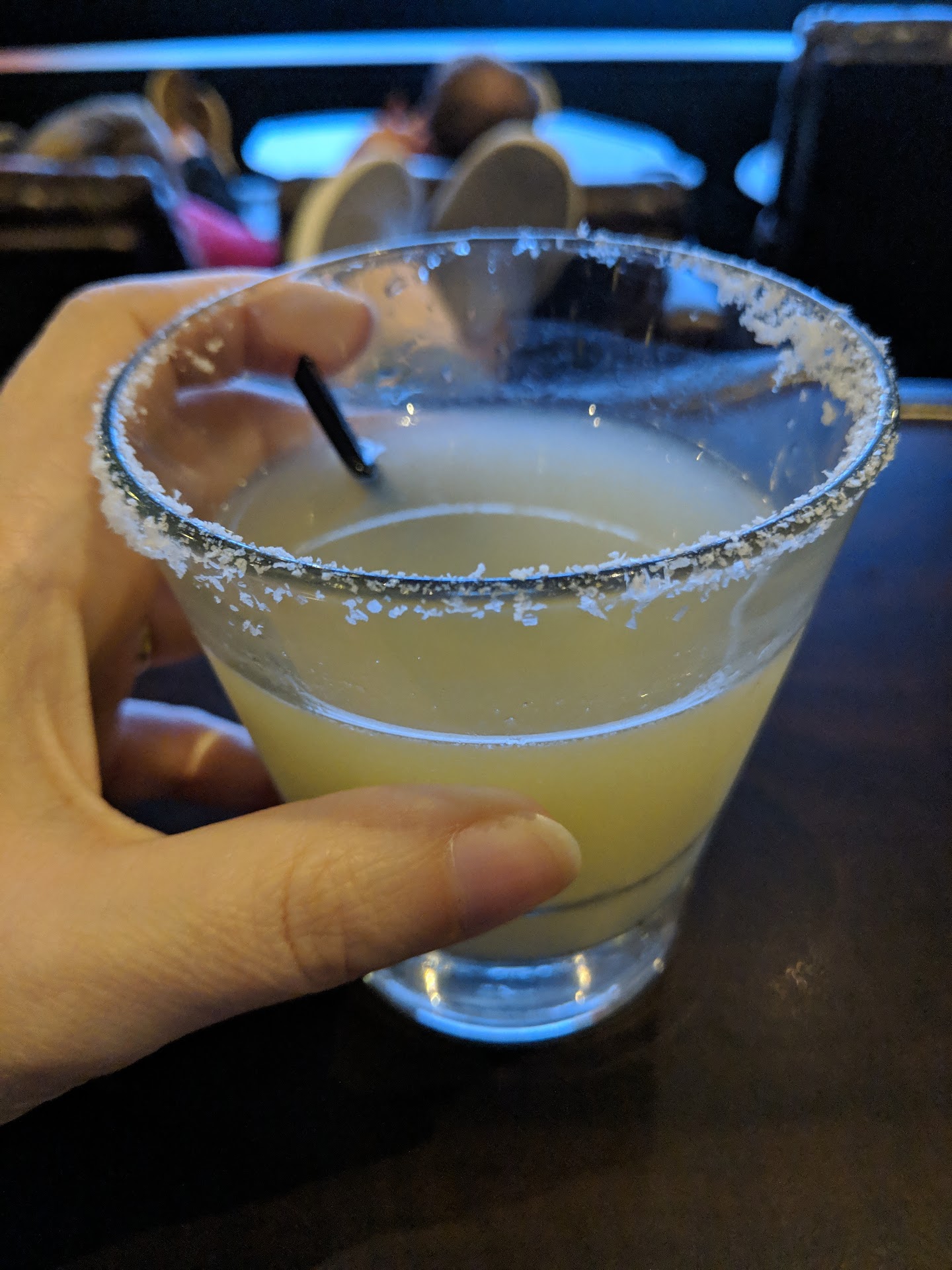 I'd also ordered a Mexican Martini, expecting that a reasonably sized tequila-based drink would help me survive the pre-movie ads, but it showed up as pictured (I promise I hadn't taken a sip yet); a glorified shot glass, maybe 2/3 full, that was not even cold. Really, the taste was fine, but it was barely cooler than room temperature. This was $10. You know, the same as non-happy hour at Trudy's where they give you a whole shaker. I think we ended up paying about $80 plus tip, which did not feel like a good value at the end of it. Two adult tickets, two meals, two drinks. No appetizers, no extras. The actual movie starting was...