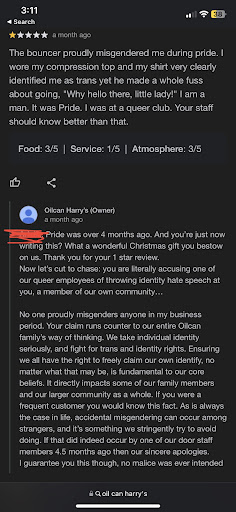 Regarding your horrible response: Of course it took me a while to leave a review. I’m not fully out. It took a lot of time to process what happened in a space where I’m supposed to feel safe and to speak up about it. So sorry it hurt your feelings on Christmas but that just so happened to be the day I finally felt brave enough to speak up. When it’s your first pride and you get misgendered by every staff member you interact with- and yes the bartender called me “ma’am” as well, if you wanna avoid misgendering then train your staff to avoid gender descriptors entirely if they’re not 100% sure, it’s not that hard- then yeah, it’s very hurtful. I also do not appreciate your use of my deadname, but I guess it checks out that you wouldn’t think that maybe I can’t use my real name on this email and that you could be causing further harm. You not only shamed me for speaking up, you outright refused to believe me. You have been very unprofessional and immature in your response. I do not believe you support trans people at all if you do not listen when a trans person calls you out- especially a shy, autistic, closeted one. You need to do some soul searching and figure out why your reputation and ego is more important than the fact that even one person felt unsafe in your establishment due to the actions of the staff. If you read this far, thank you...