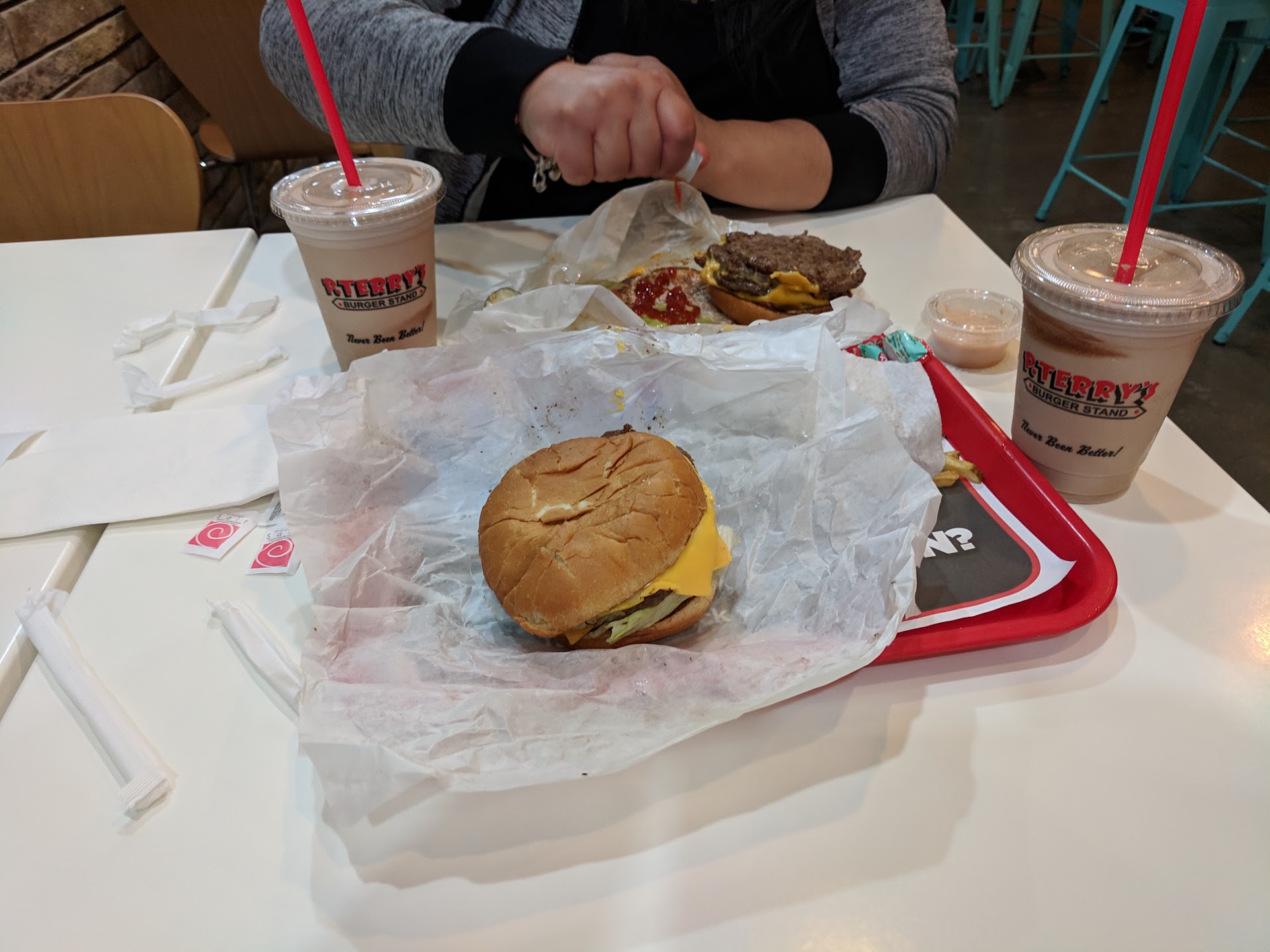 Read moreSo it's ok, I got excited when I saw the huge line in the drive thru of this Perry the Platypus themed building! Then I began to read reviews and found out some people are actually saying it's better than InNOut, it was at that moment I knew we had to try it!! So when you first arrive, you will either love the building or hate it!! I thought it was kind of cool... Then you go in and ok it's a burger place. Soo, we ordered 2 #3' Combos w/the extra beef Patty that another review mentioned we should do and got milk shakes as well. $18 not bad the similar order@ InNOut is $28. So then comes the food... They didn't charge me for fries but didn't know so I tried buying fries and they gave them to me. Thanks for being nice, but next time just give me what I ordered! (I hate free fries) to cover up incompetence. So the burgers are the star of the show... So after all this build up I realized 1 thing, P. Terry's is ok. It's truly not the best! They have a cool customer service# you can text and leave feedback but what good is it if their burgers are just ok? The secret sauce is annoying and just meh.. My wife says they should buy my secret sauce. The beef patties were all un- evenly cooked and the flavor was lacking which is odd considering there was grease pouring everywhere. So yes give this Burger a try but no for those delusional folks who are encouraging P. Terry's and telling them they are better than InNOut don't do that because then people believe it. Here is the difference between both... Yes P. Terry's drive thru is full but the inside was empty, @ InNOut both are full all the time with people. So good Burger but you got a long way to go Burger boys... But I say GO TRY THEM!! OVER TIME...