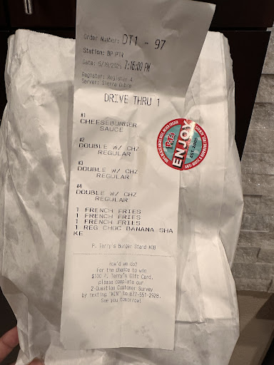 Read moreI went there drive through on May the 19th, I was ordering burgers, fries and chocolate banana shake. When I was at the window, after I made the payment the check out lady handed me the shake, it was runny like water, I told her "is this shake supposed to be like this? It's runny like water" she didn't say anything because she was confused and couldn't speak English, She only memorized the words, only little words she spoke. So I talked to the lady was behind her she wore black jacket she seems like supervisor or maybe manager? Idk, and she speak well English because I heard she talked to the customer inside the building, I told her same thing "hello miss, is this shake supposed to be like this? It's runny like water" guess what? She didn't say anything she grabbed the shake from my hand and left, she came back and handed me the new shake then left again, didn't say sorry or anything. I asked the check out lady" can I have some of the ketchup please?" She looked confused again, the I pointed my finger to the box of ketchup in front of her, she gave me 5 ketchup then accidentally dropped 2 of them on the floor, I said " you dropped the ketchup on the floor, can I have more please?" Again she is like "huh" Finally she gave me enough ketchup then again they didn't say sorry or anything. I told them, "wow.. P.Terrys burger in this location the service is totally suck!!!! They seems hate their job 3 years ago the services was great but...