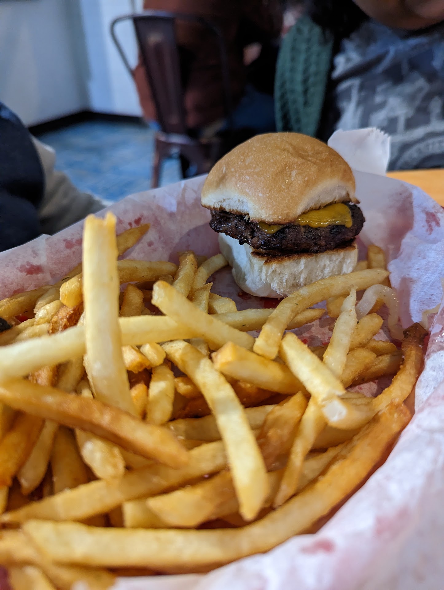 The burgers are pretty pricey for what you get. The menu is just super confusing. Last time our fries came out as sweet potato fries. I guess you have to clarify regular fries or something? Anyway, I do not like sweet potato fries at all. The meat dries up really fast and gets hard if not eaten really quickly. This makes it hard for the kiddo to eat.