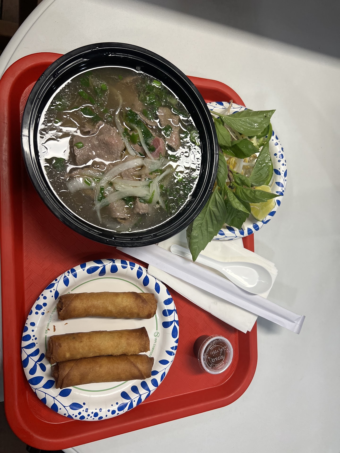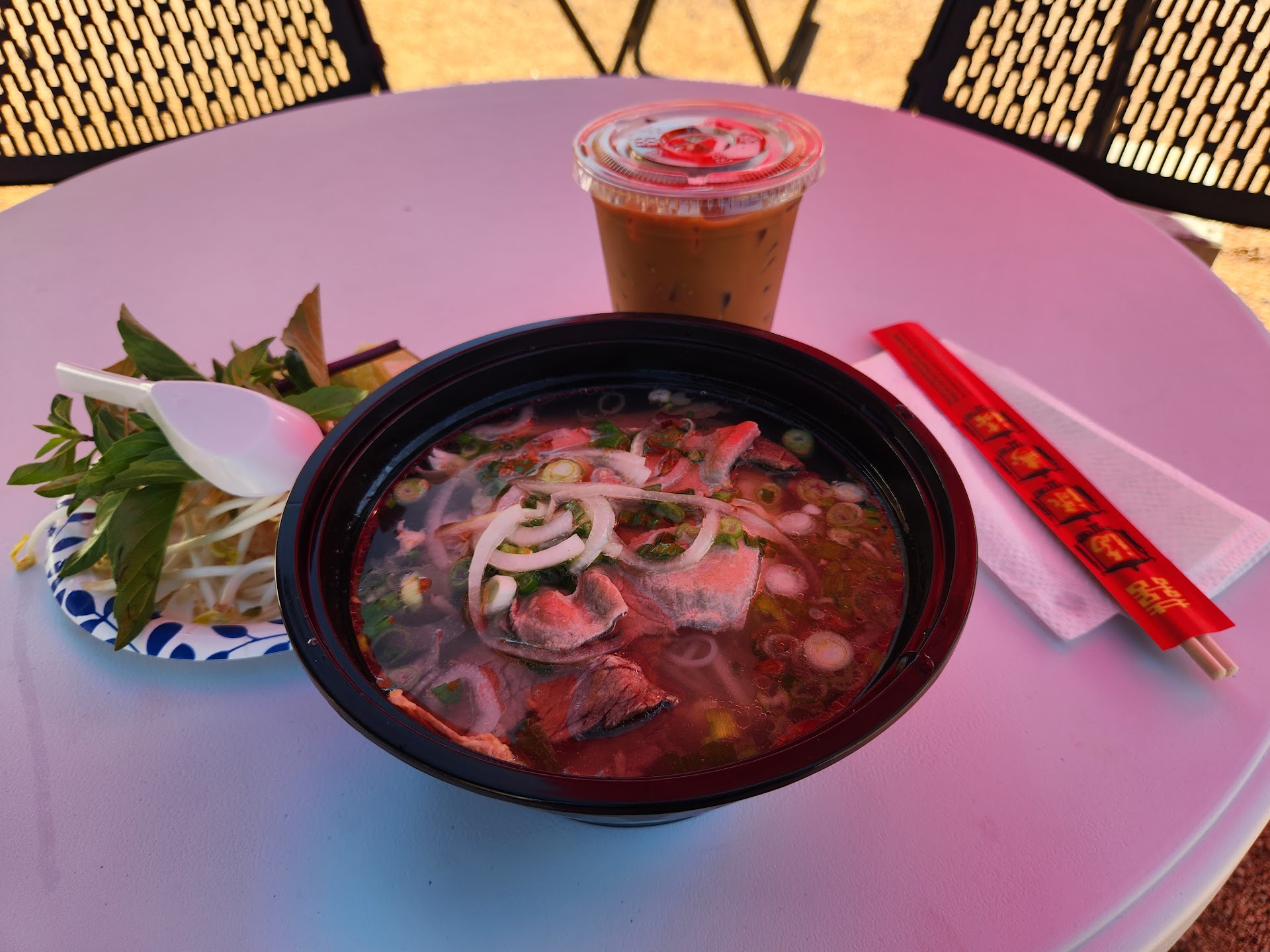 Food: I ordered pho dac biet, and it came with the typical side of veggies you can add to your pho if you so choose. If you want condiments, you'll have to ask as they aren't kept on the tables (the outdoor ones anyway). I personally didn't need them because the broth was yummy. The meat was tender and the cuts I got weren't super fatty. Near the bottom of the bowl however, the broth got a bit salty/briney. Overall, I enjoyed the pho, and walked away with a happy and full stomach.