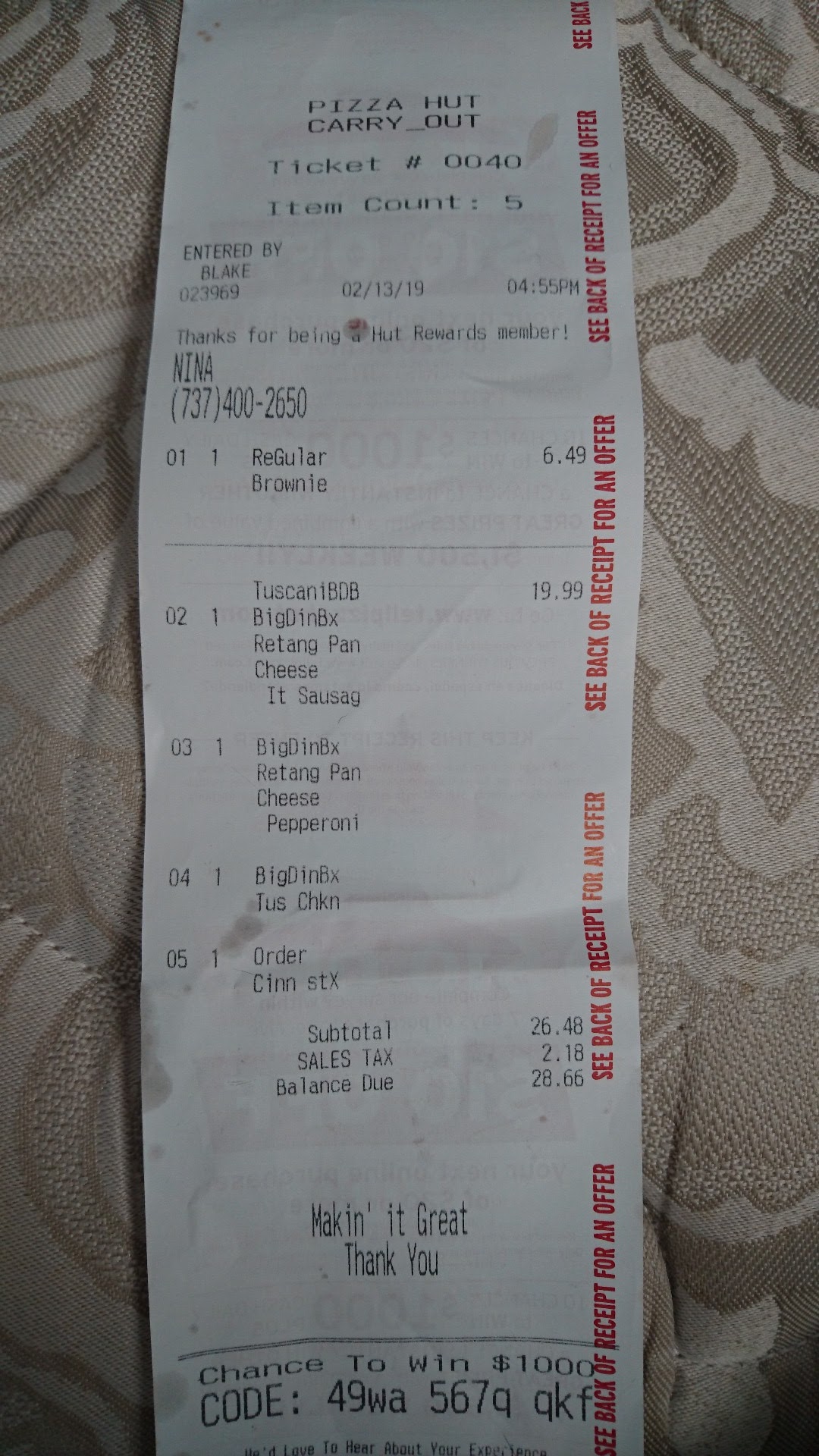 Previous Review: ordered here again 6/11/19 and the pizza/wings were actually good. The food was delivered ahead of schedule and the delivery guy was nice. The only issue I had was no one answered the phone, I had to order it online. I’ll be ordering here again soon and hope the service/food will be just as good again.