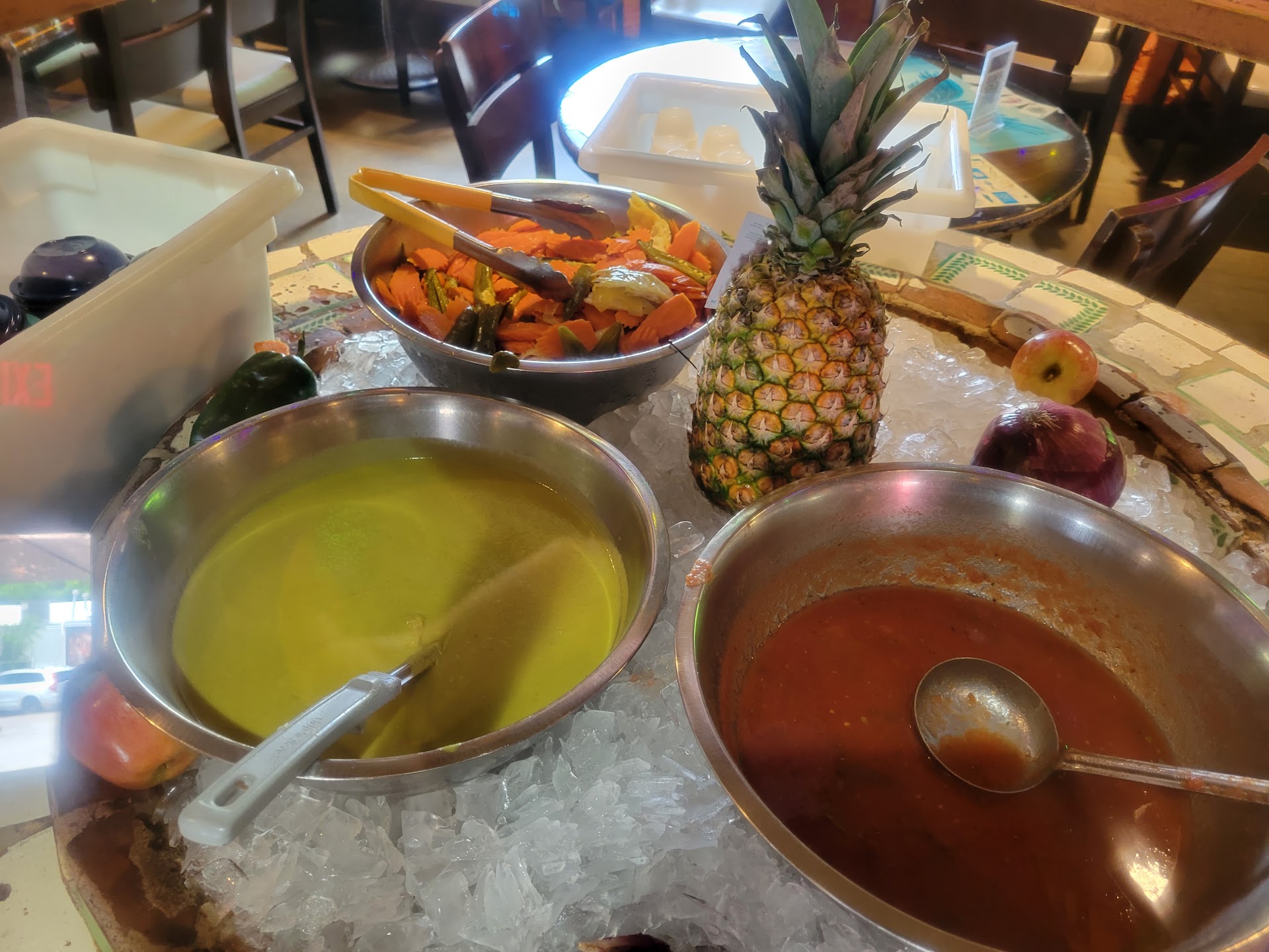 But that doesn't mean it is the only good dish. No. All the many are great !! How do I know... through the years, I invite friends, family, co-workers, and clients who are looking for a good Mexican restaurant in Austin. And every body have a good experience at Polvos. Polvos has two areas to join in the restaurant. The outside patio or the inside restaurant. Both are great to have fun and enjoy a great dinner or some good drinks from Polvos bar. Also, Polvos has their self served salsa bar. With three kinds of salsas. And carrots 🥕 pickles... soooo delicious!! I'm watering my mouth just thinking about it.