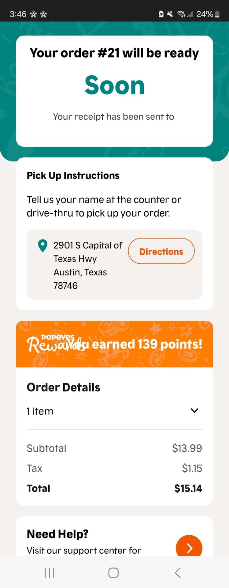 Read moreToday I visited this Popeye, I was fascinated by the good customer service they have, a charisma when serving the customer, the food very well prepared, quality of the product, very hot and excellent facilities, very nice. It should be noted that the staff was always very helpful and with a smile on their face. I want to give 5 stars for service, food and the good treatment of the manager...