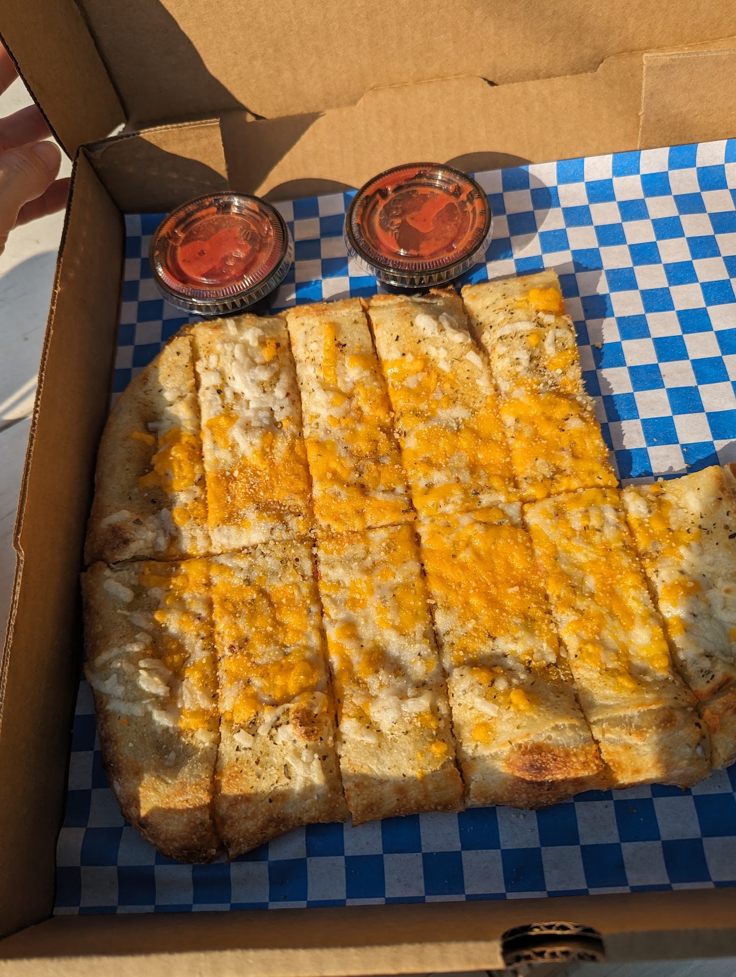 We got: -Large pizza with pepperoni's and half jalapenos, spicey & delicious! -Motz sticks! Yummy! &! -Fried wings, with buffalo sauce on the side. (The best dank fried wings I've had!)