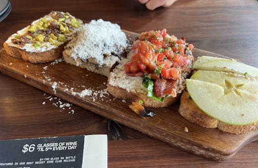 Most important as always- the food! I ordered a bruschetta board: -Brie, Apple & Fig- delicious! It doesn't look like much but the combo of flavors was top knotch, loved the rich cheese and the crispness of the apple, and the amount of toppings was perfect with the amount of bread. 2nd favorite. -Burrata, Bacon, Arugula, and Tomato- this one looks great, I love the tomatoes piled on top, and it was juicy and tasty with a nice punch of flavor from the bacon. This was my 3rd favorite but I have nothing bad to say about it, I just liked the other 2 even more! This is a solid choice. -Ricotta, Dates & Pistachio- least favorite and I actually didn't love it, wouldn't order this one again. The toppings tasted good, but the ratio of toppings to bread was way off. Each bite tasted 90% of bread with a little smear of cheese and some pistachio. I think it really needs more cheese. -Mushroom and Mascarpone- The BEST. It's probably mostly because I love mushrooms, but there was a mountain of mushrooms! The toppings were piled on there and they were perfectly sauteed and juicy and went so well with the mascarpone! We fought over this one lol.