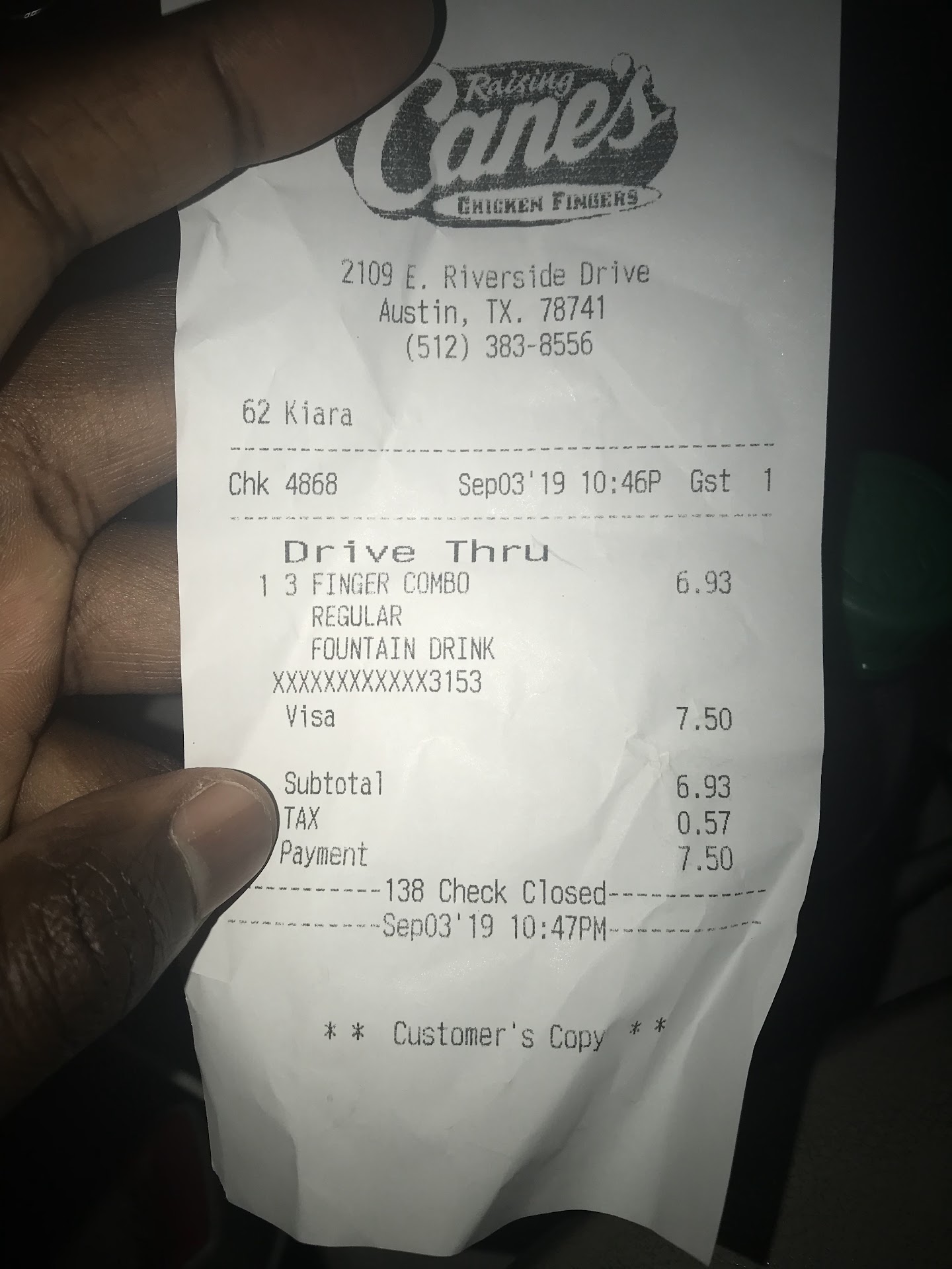 Read more6:45 P.M. East Riverside. The line was long. Austinites had their stimulus checks and the line of cars went around the block. An employee named Luis was stationed outside of the pick up window and He. Deserves. A. Raise. A. Bonus. I commend him so highly. HE is literally at the front line, by himself, in gloves and a mask and following all of our city mandates, at the highest risk point by taking food from the window and taking it up to our cars. I don't know how long he had been stationed out there, but my boy Luis deserves some form of compensation. I know the whole crew inside was working hard fulfilling our chicken tendie needs but Luis was one brave, exemplary employee who appears to meet and go above and beyond the Raising Canes mission and deserves that accolade in the way it counts - a promotion, a raise, a bonus. Whatever y'all gotta do. He is why we will come back, but we hope he can be provided with safer measures to keep doing his stellar, outstanding...