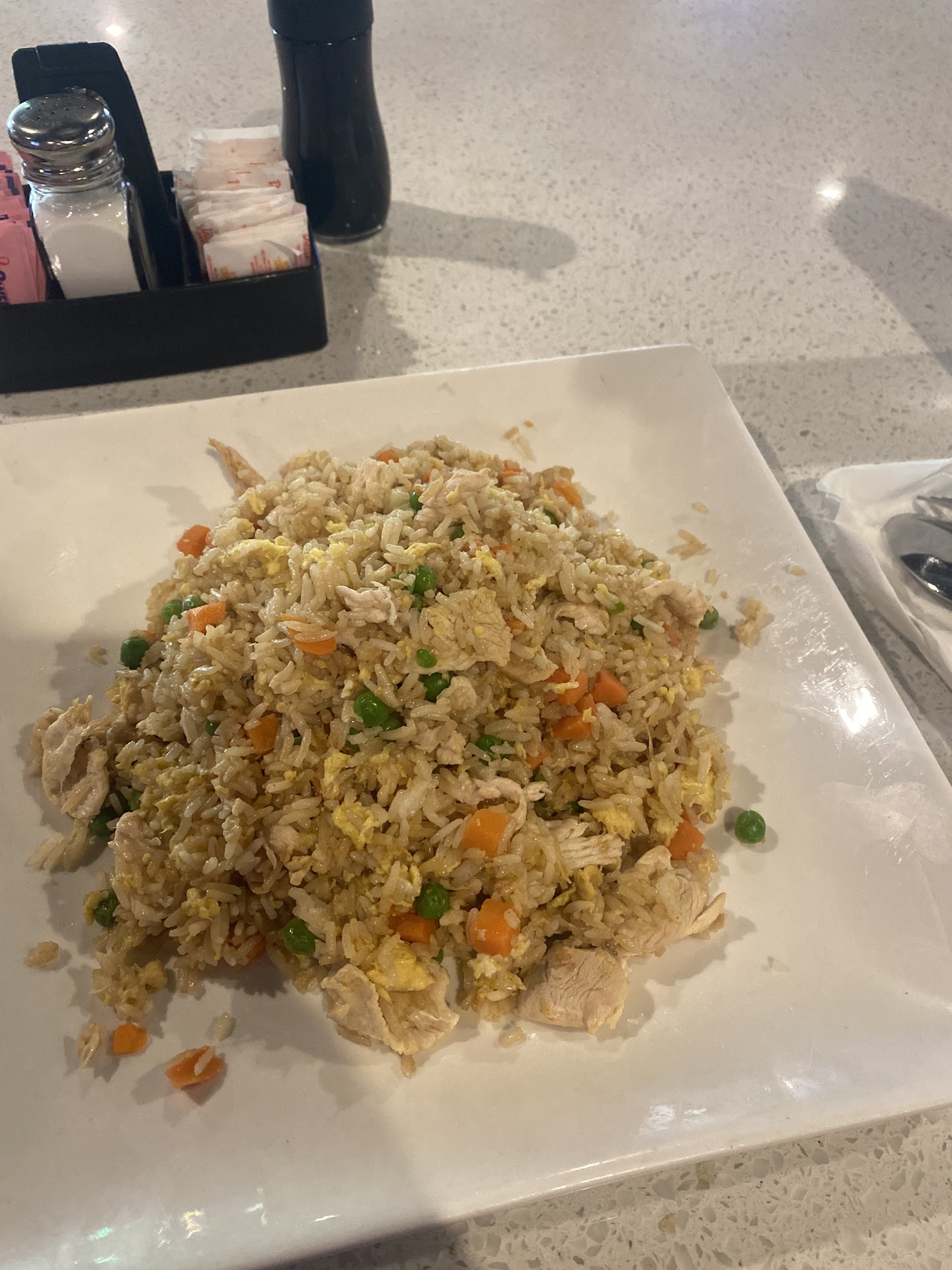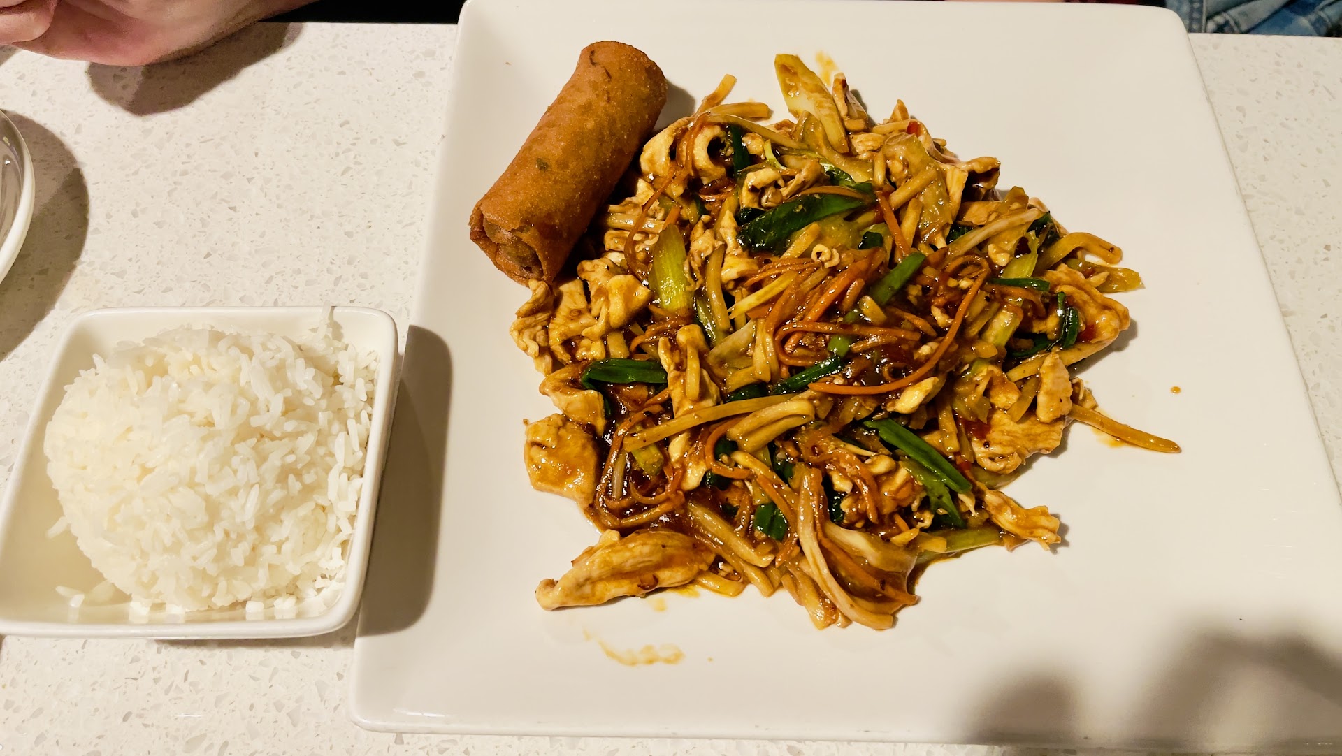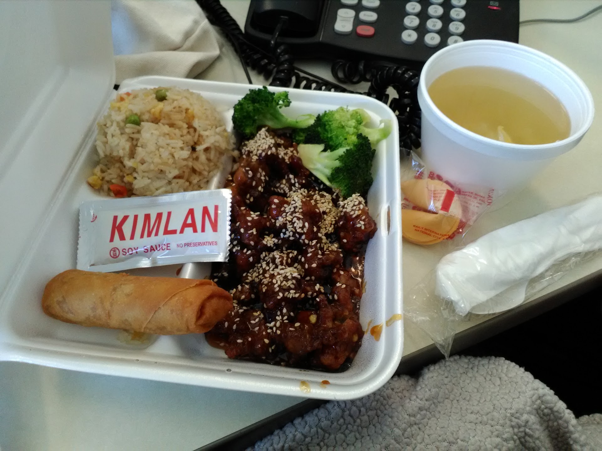We had two main courses. General Tso and I can’t remember the other one but it’s pictured and was based around chicken. That one was pretty good. The general Tso chicken though was so tough you couldn’t cut it with a knife. It was not good. Would not order that ever again.