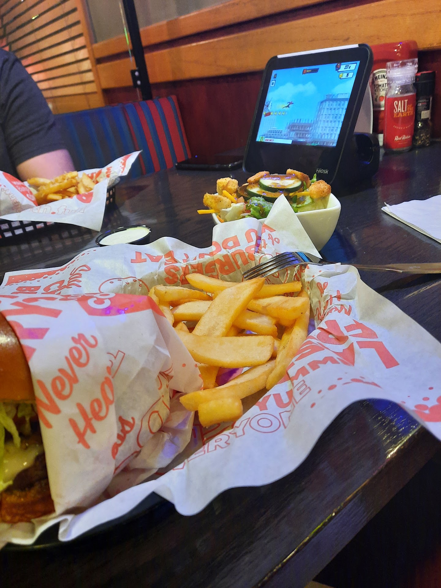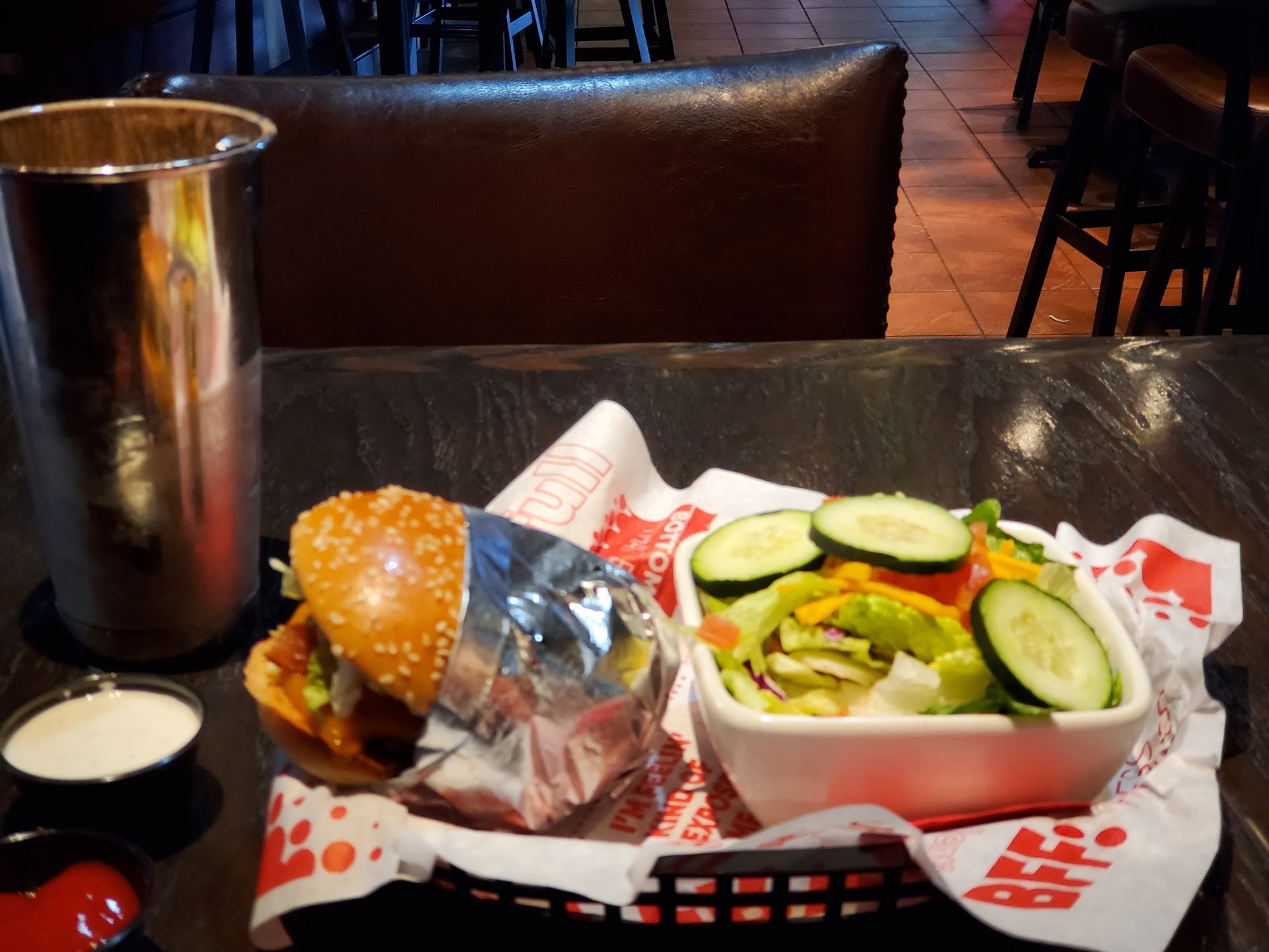 Read moreFINAL REVIEW: the restaurant no longer offers the petite version of their burgers, so I will not be returning to this restaurant chain. That said, my friends do love their full sized burgers, their steak fries are seasoned well, and the side salad option is satisfying. Because the petite burger was gone, I ordered the crispy chicken salad. It was terrific: chicken was very crunchy, cut in good sized pieces. The salad had bacon, egg, and cheese included. My one complaint is that the egg is diced like carrot shreds, which made it hard to get on the fork. If the salad was so good, why am I still never returning? This is a burger restaurant. I can find chicken salads all over the city.