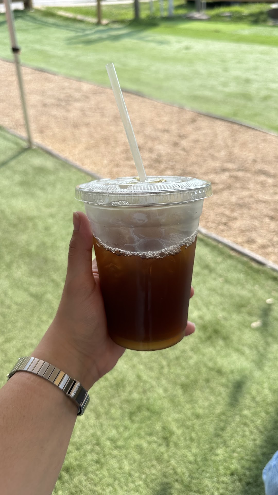 The ambiance is lacking and does not reflect the steep pricing whatsoever. It doesn’t smell great and there’s a porta potty next to the picnic tables. There are also feral cats that seem cute, but they are very bold and will persistently try to steal your food! However the string lights add some charm.