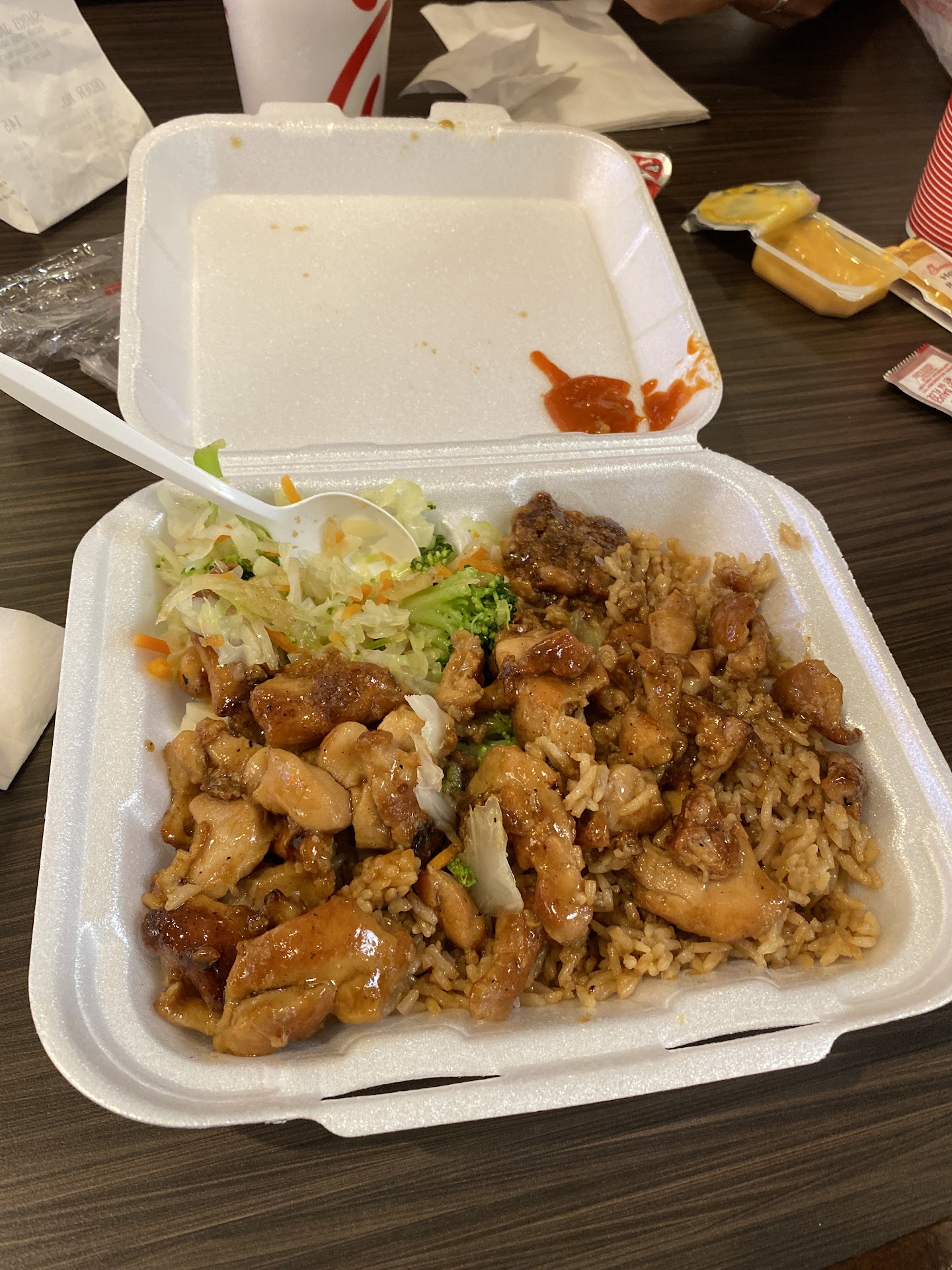 First time at this establishment. I'm a visitor from san antonio. While there I ordered the chicken & shrimp. Bill $12 & change. I have a son with a seafood allergy, so I requested a separate plate for the shrimp (my son & I normally share food). The chef then suggested he place the shrimp at the top of the lid. I again requested the shrimp be apart from the chicken as I have a son with a food allergy. The chef then said I should have told him at the beginning of the order because now he has to go back to the register to get another tray. I apologized but was still continuously chastised for my mistake. I was also not aware that the forks were at the beginning of the line. So I placed my food down and went back to get a fork. I passed the same chef who was telling other customers about the incident, as if ridiculing me. He definitely looked a little embarrassed to see me. I dropped my fork and didn't even feel comfortable to go back to get another. Needless to say, I will not include this...