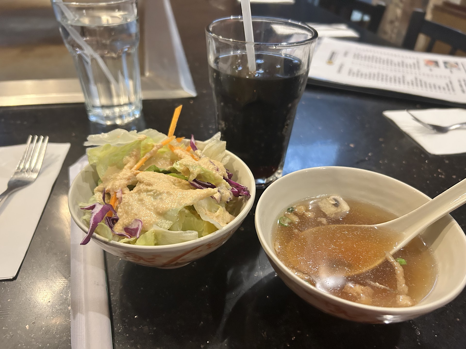 Waiter took order immediately, brought salad and soup, and then disappeared until checks were ready. The order was wrong for both husband and myself and I ended meal with nothing to drink. Also, my husband had to ask for silverware and napkins since no one noticed his seat had neither. Other tables arrived after we ordered and their chefs came out first. We waited 45 mins before a chef was ready to start. The grill BEFORE our chef started was dirty and had leftover rice all around the edges. He didn't bother to clean it before he started cooking, dumping our rice on top of it.