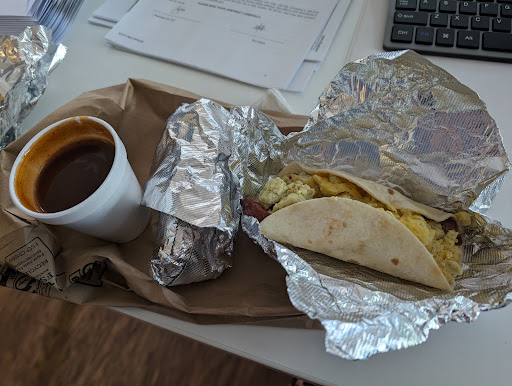 The sausage is link style smoked sausage, they do not have breakfast sausage or bacon, so don't go looking for the more common breakfast taco items. Your choices are link sausage or ham, with egg and potato.