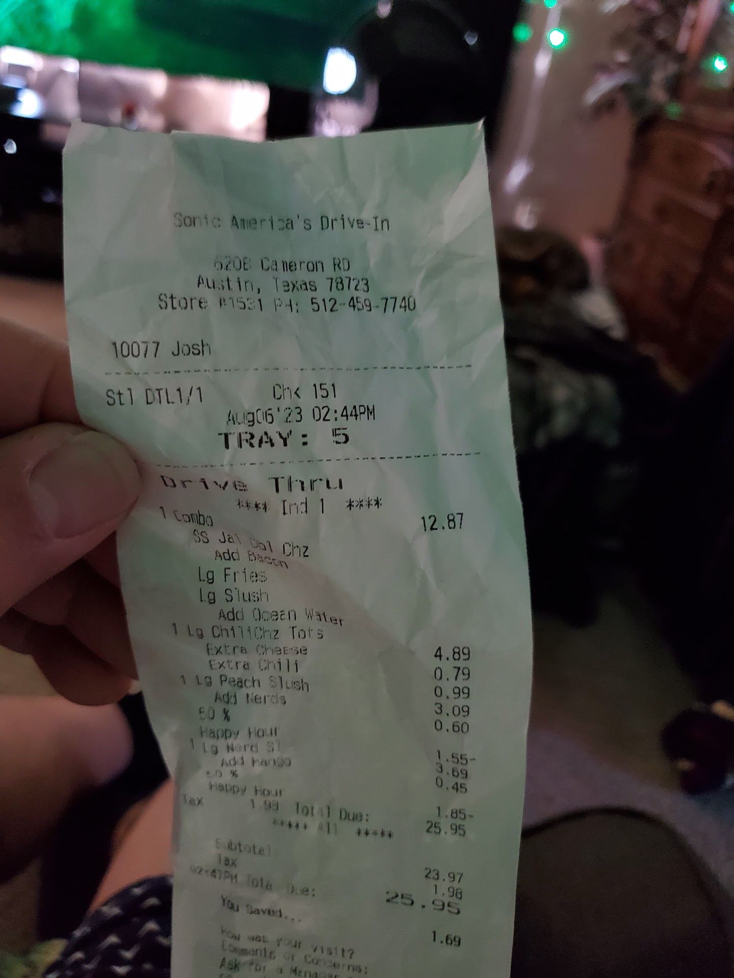 Read moreI've never reviewed a fast food place. I've never had reason to not like a Sonic. Something is wrong with the Sonic on Cameron and 290. I've gotten maybe ten free drinks for slow service. I've been forgotten entirely. I've pushed the button and never been asked for an order. I mean it is right near my house and I like Sonic, so I go but not to this one anymore. I'll go a little further to any other option next time. Twenty minutes on a slow night and no one answering my button push just to ask what is going on with my order is just the last straw I guess. They've taken fifteen minutes for a tea before. Twenty minutes for a chili dog and fries. C'mon man.