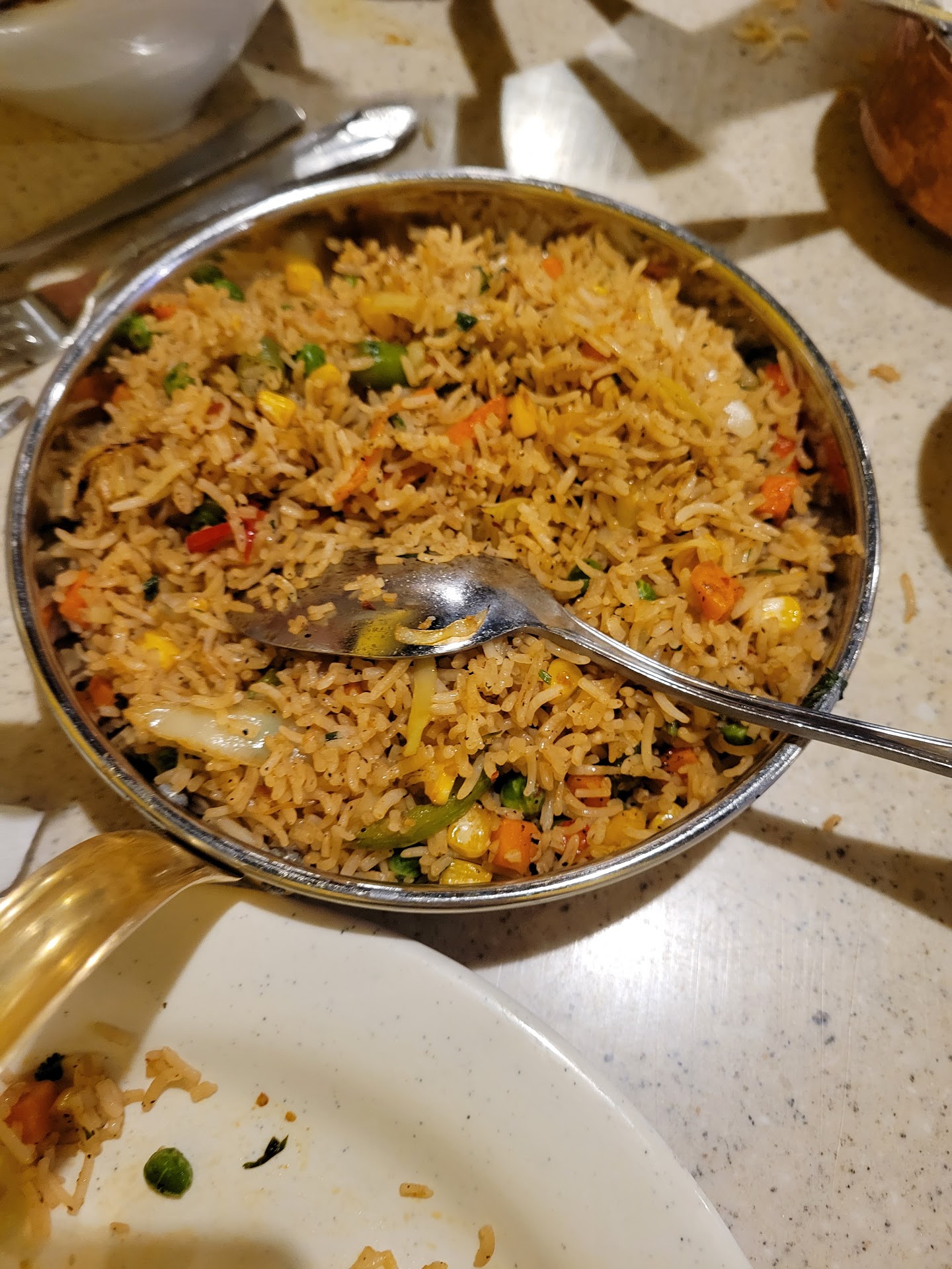 Upon arriving, we were greeted by a lunchtime buffet that featured both vegetarian and non-vegetarian options. However, after perusing the offerings, my friends and I decided to opt for the à la carte menu, as the buffet failed to entice our vegetarian palates. Our selections included Paneer Biryani, with varying levels of spiciness, Paneer Tikka Masala served with rice, and Garlic Naan.