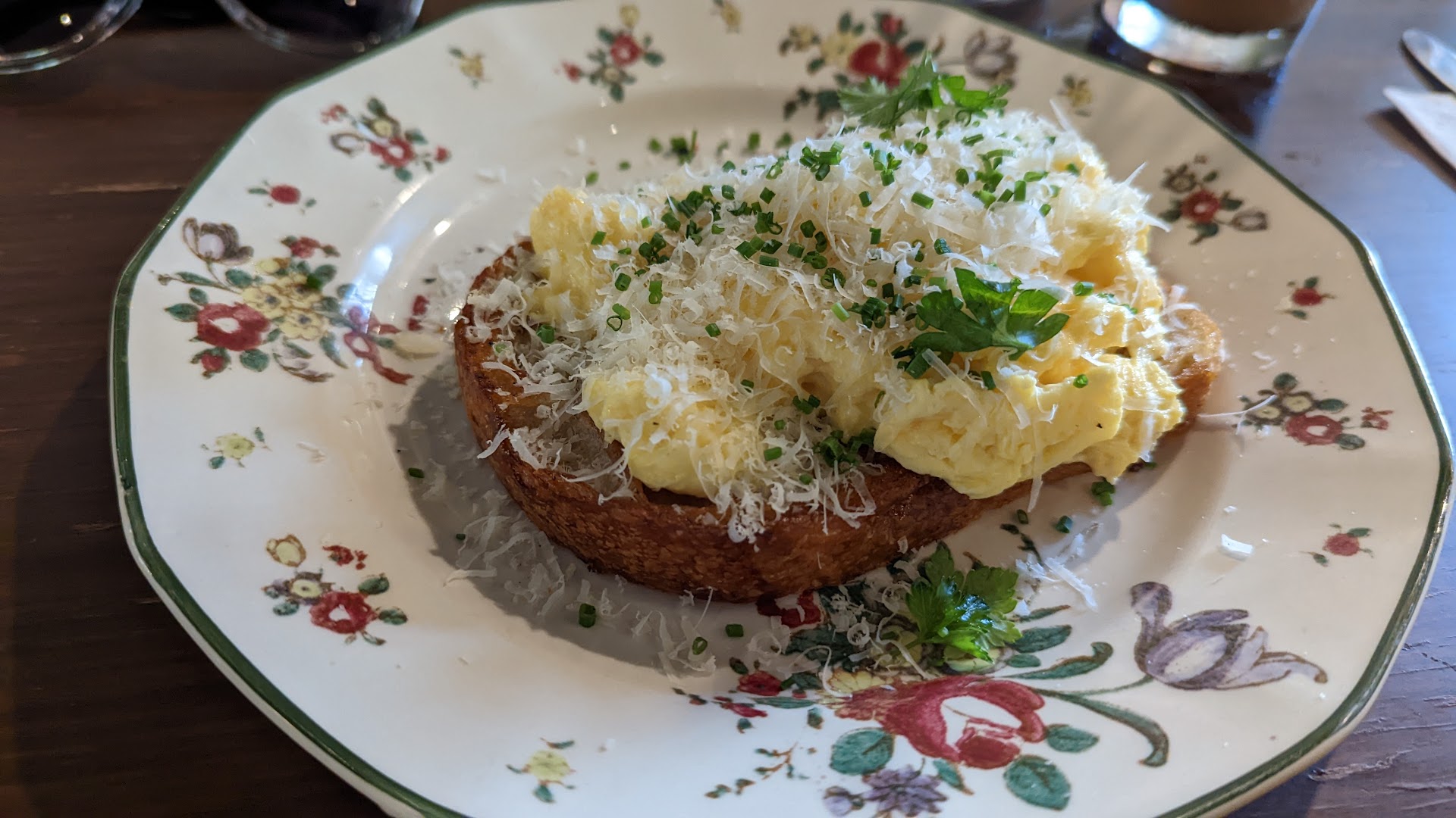 I had the cheesy egg toast, a bowl of fruit, and a large cold brew with vanilla and macadamia milk. Everything tasted pretty good!! The eggs were nice and fluffy and the cold brew was delicious even though it settled a little while I waited in line to order (I was early and ordered just a coffee at first since I didn't know how long I'd wait and hold the table). I took the only table available. The place is pretty small so I'd arrive with a lot of time to find one because there are no reservations. The prices were reasonable and the sandwiches looked amazing for me to try next time! The fruit bowl was artfully presented although there were not a lot of fruits, I liked how much care was taken to slice the grapes and arrange the peach slices in the bowl. There are a lot of plants making the ambiance really pleasant for Sunday brunch. The little magnet wall was just a touch of Austin weird, I loved it! I also had a bite of my friend's pancake and with the chocolate chips it was...