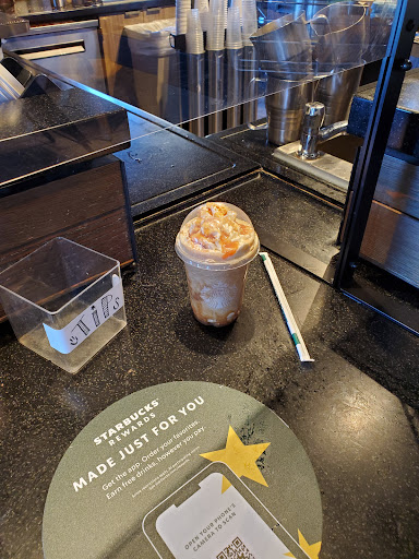Read moreMost recent in-store experience found a polite barista taking my order. There was a nice atmosphere in the store. The dining room was in order even though it was 5 pm. My recent drive-thru experience found a very cheerful person taking orders; the employee handing me my order checked to see if I wanted to use points. It's been so long since I've ordered without the app, it's nice to see they are still doing this. On a visit prior to COVID there was a new drink introduced that I had questions about, and a barista took the time to slow down and explain the drink and its preparation (much better info than simply saying "it's espresso with chocolate..." for example). That was a terrific interaction (and one that prompted a kudos call to Starbucks Customer Service!). Only drawback to this location is parking. Very few spaces, lines are faint, lot is tight, space is shared with a bank so spaces are unavailable, and there is an exit that makes pulling out challenging. You also must stay aware of drive thru traffic if you are pulling out of the lot. Good thing you are here for caffeine--you need to...