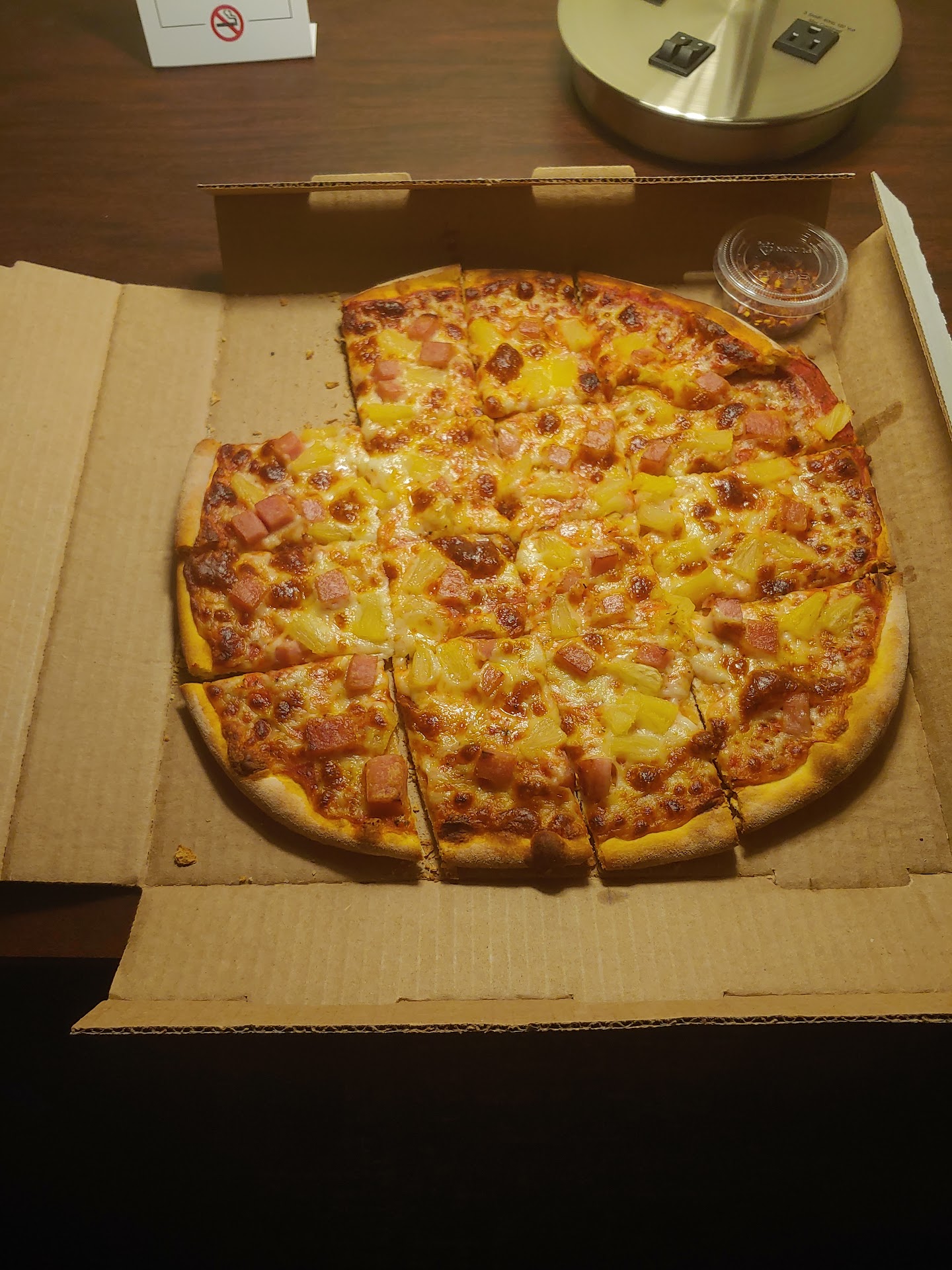 I know pineapple is divisive on pizza F..... Off to the haters. Ordered dude said order back as i did. 12" Hawaiian sub spam for CB. Well done. Pepper flakes Chef salad with french and blue. That will be there between 40 and 50 mins. Showed up in 42 minse. Thumbs up