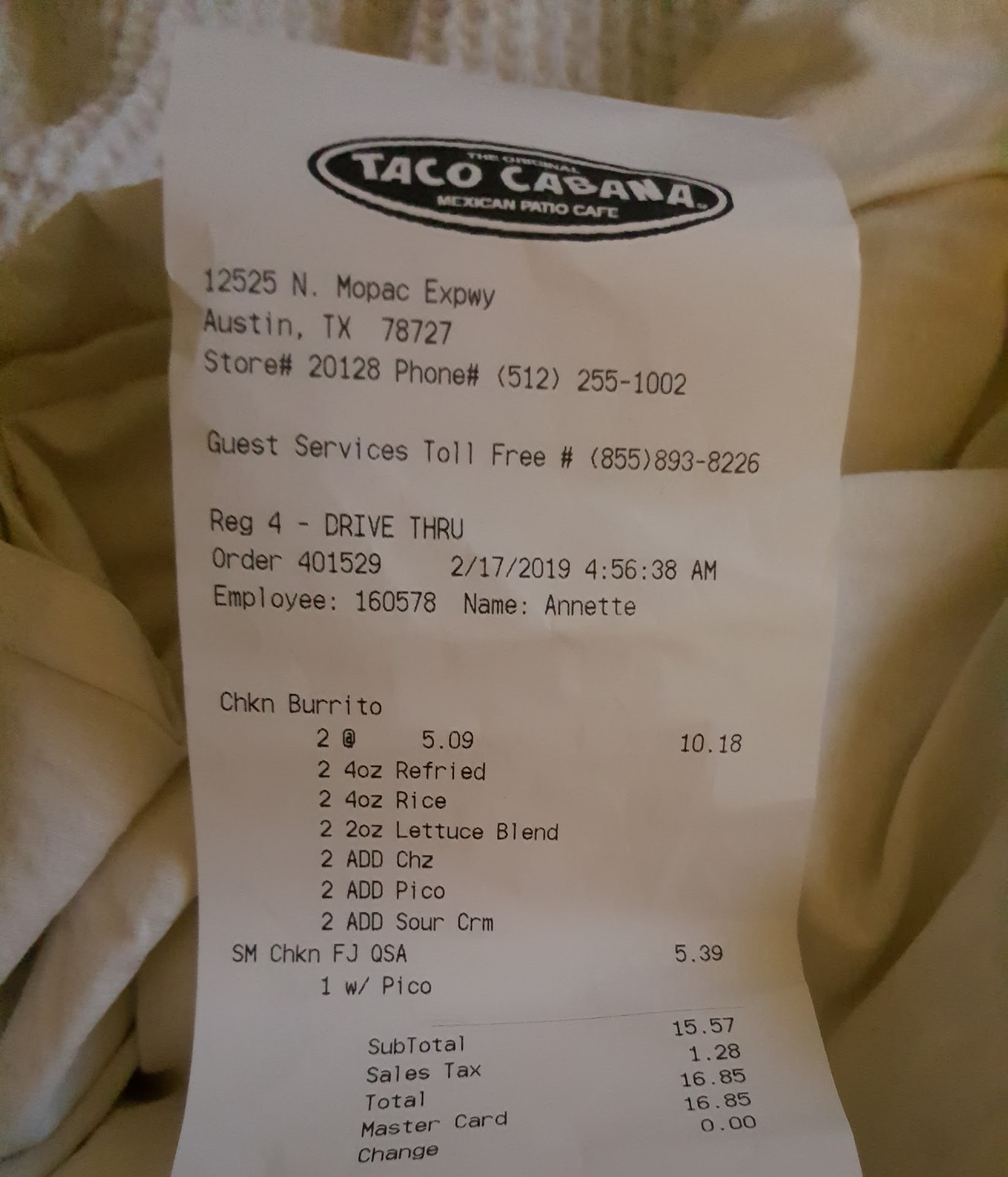 Read moreMy last review for this location (2 yrs ago), was centered around a couple issues of quality, volume, and consistency in quality. I cant actually say if its improved or worsened, ... since I stopped frequenting this specific location and then moved to another city a few months after. The reason for this update is to shed some light on a growing problem seen throughout the greater Austin area in all hospitality and food service industries. The need to remind hourly millinial employees everywhere that just because you were coddled and spoiled as children and sheltered from any adversity or even the word "no", as an ADULT in the working world and especially in a customer service driven industry, it's NOT about you and if you don't like your job or the people you serve, and yes I said serve, then you need to leave the job and continue sponging off mom and dad. We don't want you giving Us dirty looks, and treating customers like we are interrupting or bothering your personal time. Case in point 👉 today's visit to Taco Cabana to give them another chance and see what's changed in 2 years. There's no more shelter in place and covid has been gone for over a year now, so restaurants have all opened their lobbies again for quite a while now actually. So why, when I go to the door at 9am, the first door was open, then the second interior door was locked and I couldn't get it, even though the very visible, very well seen hours of operation sign says that it should have been open for a few hours already. So as i was coming up to the second door the "millinial" brown haired young female behind the counter walked.over to the Same door VERY QUICKLY. I THOUGHT she was coming to make sure the door was unlocked but as soon as she saw that I tried and couldn't get in, she turned around very dismissively! I tapped very lightly on the door to ask her since the signs obviously incorrect, when do they open? But she didn't even make eye contact, she flung her hand upwards in the VERY recognizable GO AWAY fashion. There's no call, no excuse, and no way I'm EVER going back to this...