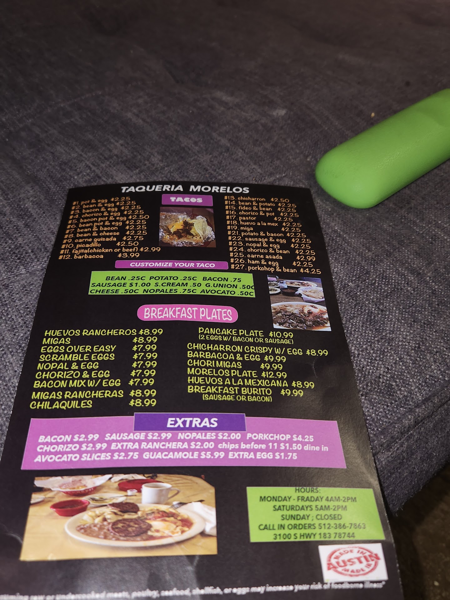 We ordered breakfast tacos to go (I got huevos y papas c/nopales, while my wife got fideo y frijoles.) I opened my wife’s taco by accident, but I saw enough to know that whenever I’m feeling under-the-weather, I want fideo from Taqueria Morelos. We both got salsa verde. Wife didn’t end up needing hers, but it had the perfect level of spice.