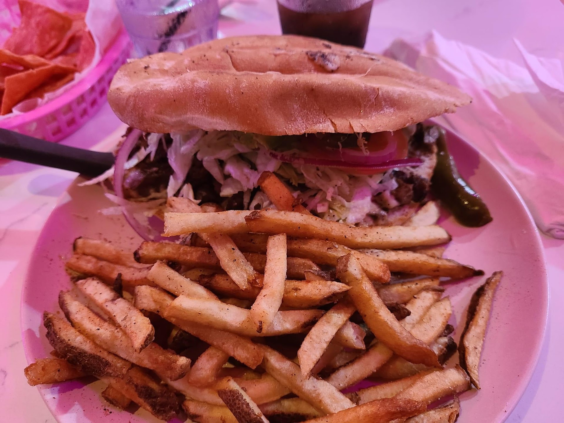 Read moreWent recently and Loved the atmosphere, it was a three hour drive to this area and this one was one of the restaurants I spotted to check out in the city. When pre planning a list I really would like the website to say you have to pay $20+ for parking! No one was outside to help either because the parking signs were worded confusingly and there wasn’t a parking manager out there. I found out once inside that if I don’t move my car I could get a boot on it and it cost over $100 to get it off. My Spouse then had to go find free parking that was supposedly nearby (nothing nearby was open, we could’ve known this before sitting down if it was on the website) and was gone most of our visit just trying to find somewhere to sit. The parking fiasco pretty much ruined my visit, I wish there was more people checking it or if it was written on the front page of the website. The food was okay, my fries were kinda soggy and my bun was burnt (but could’ve been charred on purpose) as it definitely didn’t feel as attractive as the photos but it was alright. The lighting was a lot dimmer than I expected since the pictures are so saturated and pink. I didn’t go at a sunny hour so the lights had to carry the atmosphere and it ended up just making the place feel like it’s really dark inside. Our waitress was nice and attentive but that was the most positive thing I got out of the experience. Nearly getting trapped in Austin 3 hours away from home wasn’t great. Suppose I just caught the place on a bad day, the decor is really cute and the photo op spots outside are adorable. The seating though the tables are really close to eachother is fine and comfy enough. I’m just really glad while sitting inside for 5ish minutes waiting to ask about parking wasn’t enough time for them to boot my car because by the time we found out we had already been there a while. It was scary and ruined dinner thinking if I went outside my car was already locked. Thankfully it wasn’t. Oh and the biggest cherry on top was that it was pouring rain to my spouse had to go find a free spot close by and take a few minutes walk in the rain just to get back and was drenched. REALLY WISH I COULDVE KNOWN...