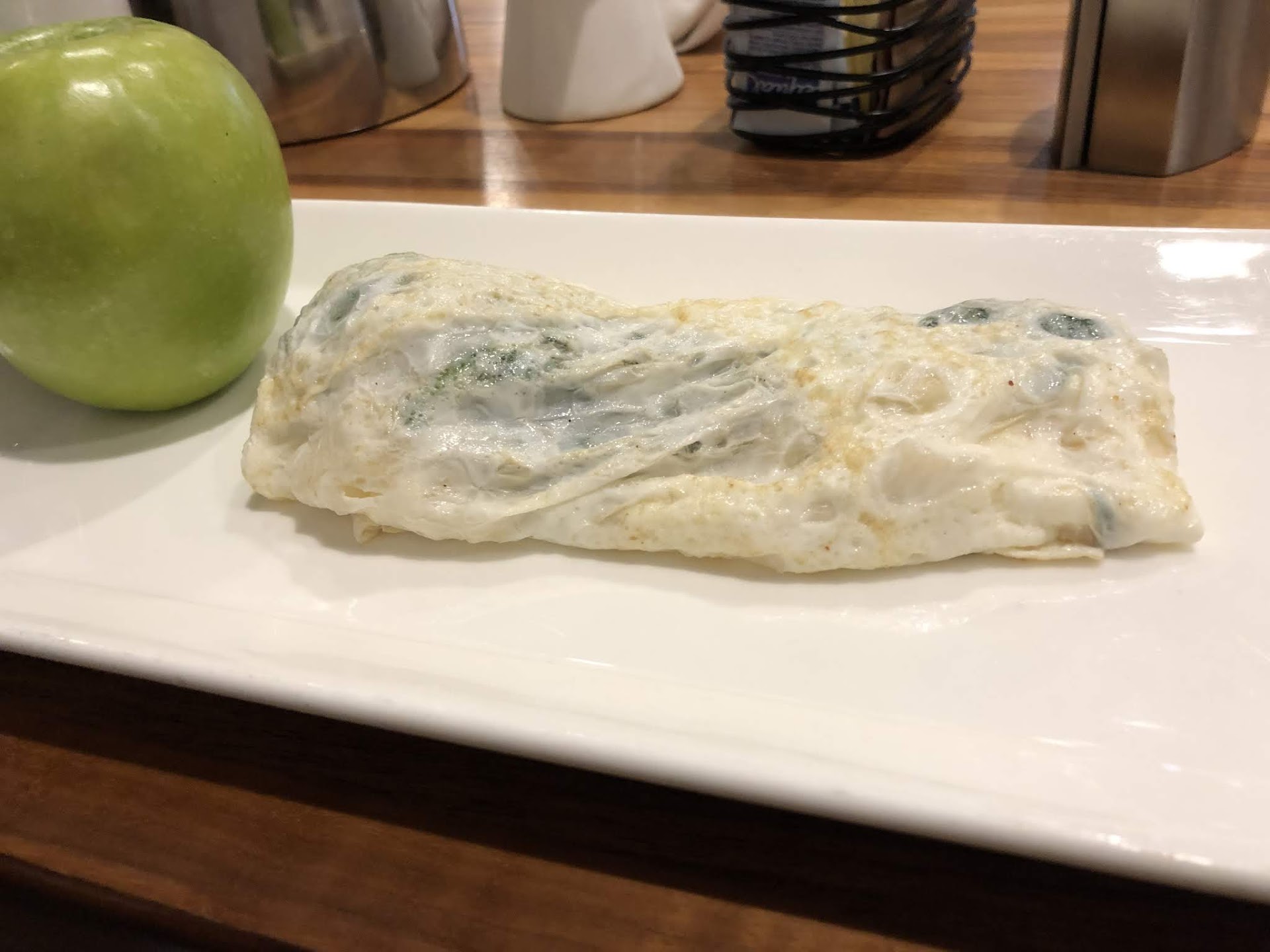I ordered an omelet made with egg whites, spinach, onions and swiss cheese. They forgot the cheese and it was fairly sad looking omelet. (Cooking egg whites is tricky and a lot of cooks don’t quite have it down) but it tasted fine.