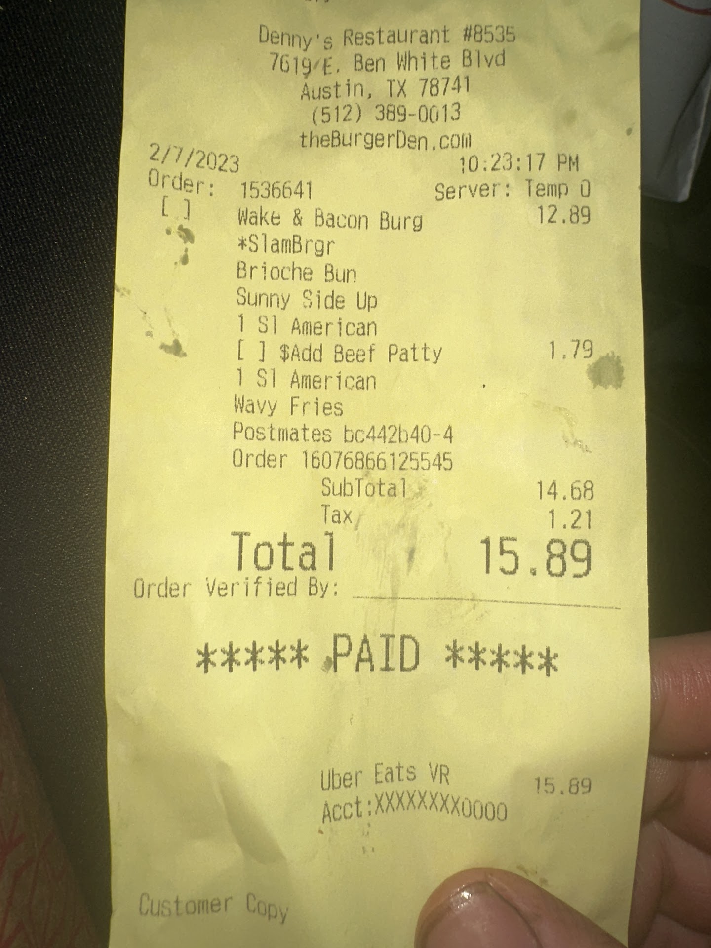 We ordered this through Postmates and there is no indication that this is actually Denny's. My partners order was made wrong and only got 5 onion rings. My burger was good but not great with about a half an order of fries on the side. Everything was mediocre at best on top of being deceived about the restaurant. The delivery driver was fast & friendly though so...
