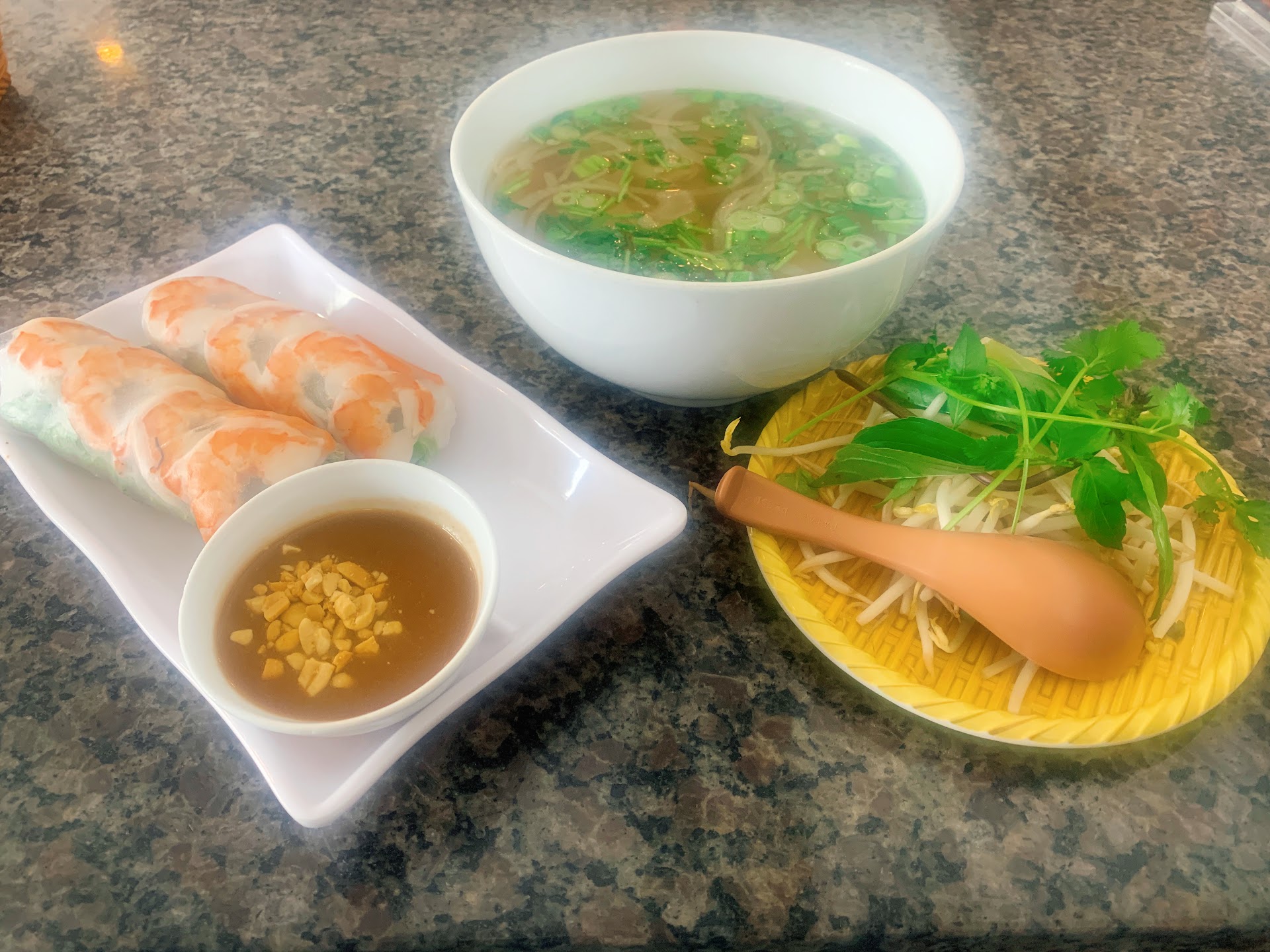 Server was quick to have us seated, hand out menus, water, and took our order. Food was served within a reasonable time frame. A different person served us our food (I think she may have been the cook since she was coming from the kitchen) and noticed that the server had forgotten our utensils. She told the server to set our table up, and the server promptly came with a pre-set utensil basket. My husband ordered pho, but I noticed the typical pho spoon wasnât given. We were planning to ask the server for it next time he swung around, but for the remainder of our time, our server didnât stop by. In the end we just went with the metal spoon that came in our basket- not too much of a big deal, since we saw there was only one server at that time who was busy managing the front register and take-out orders. Itâs a little unexpected that there would only be one server for the restaurant on a weekend during lunch service, though⊠so come with the thought in mind thatâs service may be lacking due to being understaffed.