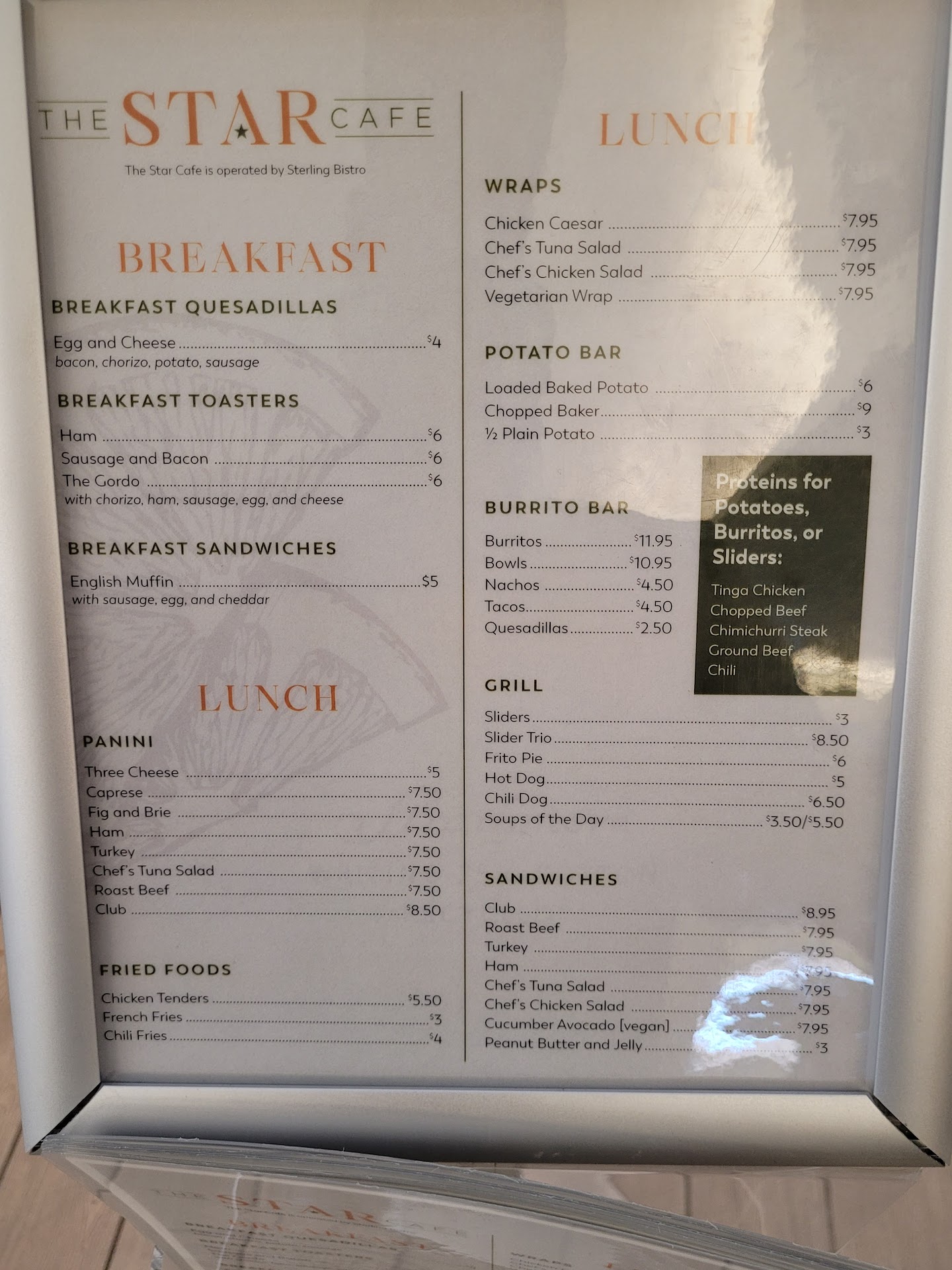 Read moreThis place is unbelievable! They have a wide assortment of drinks and food, and tonnns of space to sit. They have outdoor seating on a balcony overlooking skyscrapers! The food I recommend the beef tacos, I tried the other flavors and they just weren’t as good. They have this huge potato they give you with the potato orders. They have fresh salads you can get, and ice cream too and hot coffee. This place is great. It’s not SO expensive either like everywhere...