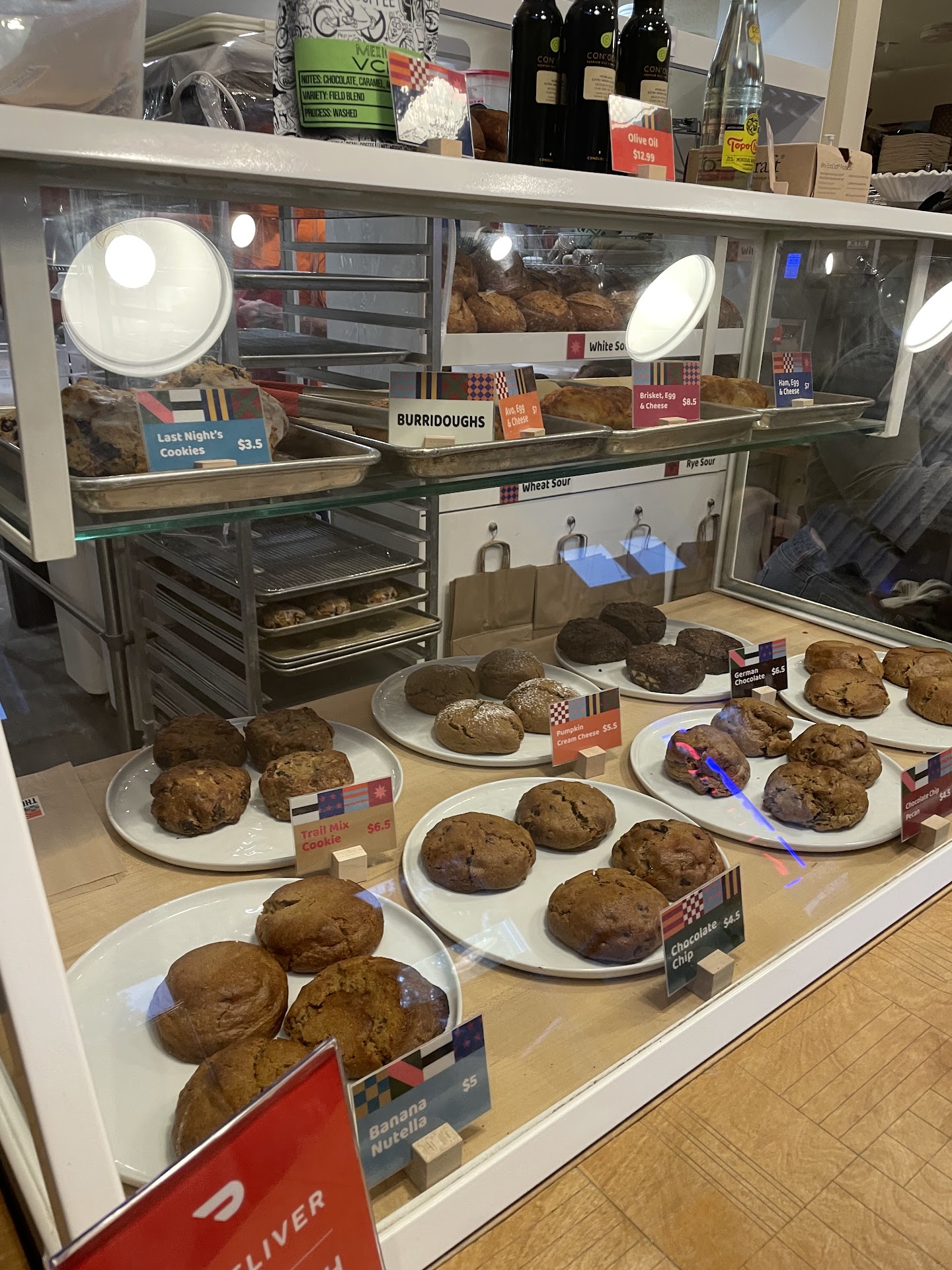 Located next to convenience store with a small parking spot that has only 4 spots shared with other business, this grab and go place has some really delicious bread and cookies. Their cookies are a little more on denser bigger side, kind of like Levain style cookies except with more filling in the middle if you get a stuffed Ollie and not quite the crispy bottom that Levain bakery cookies achieve. I got their classic chocolate chip cookie, which was good and for being such a big cookie filled with chocolate chips I am glad it wasn’t overly sweet though you can definitely split one cookie with two people. I also got the Banana Nutella cookie which reminds me if banana bread decided it wanted to make a little sandwich with Nutella in the middle and then shaped in cookie form. It’s more of a doughy cookie than chewy or crispy cookie. We also got the chocolate peanut butter cookie and you better love peanut butter because the peanut butter is strong, but delicious. We also got the wheat sourdough loaf and the crust on it is incredible and I loved that they do the fancy markings on top to like one the bread/steam to escape (I should know what it’s called but I never got into my sourdough era). Even for being made with wheat four and having blend of seeds, I did not find it too overwhelming and found it delicious to make a grilled cheese and loved that even though it’s healthy it didn’t taste overly grainy or overly “healthy” if that makes sense. It had a really great crust and interior and some nice little bubbles. I also got the avocado, egg, and cheese burridough which I thought it was ok - I wish there was more filling, I found that the bread to filling ratio was more bread than filling, and wish the filling had more salt/flavor. I am glad it came with mild salsa to dip it in to give it that extra kick/salt it needed. Probably my least favorite out of everything I tried.
