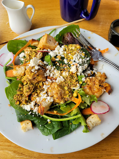 The menu is awkwardly written so you don't know if the salads are entree sized because they are listed under appetizers but there is a side salad listed under sides. There is a beautiful artistic print of a tree on the menu but that makes it hard to read. It looked like they needed to fit the salads/protein add-ons somewhere on the page but there was no space in the entrees column. Out off the 10 or so items listed under appetizers, only 4 or 5 seemed like actual appetizers. Menu was awkward. Separate alcohol menu and separate coffee menu. Seems like putting desserts on a separate menu also would have given more space to make the menu less awkward.