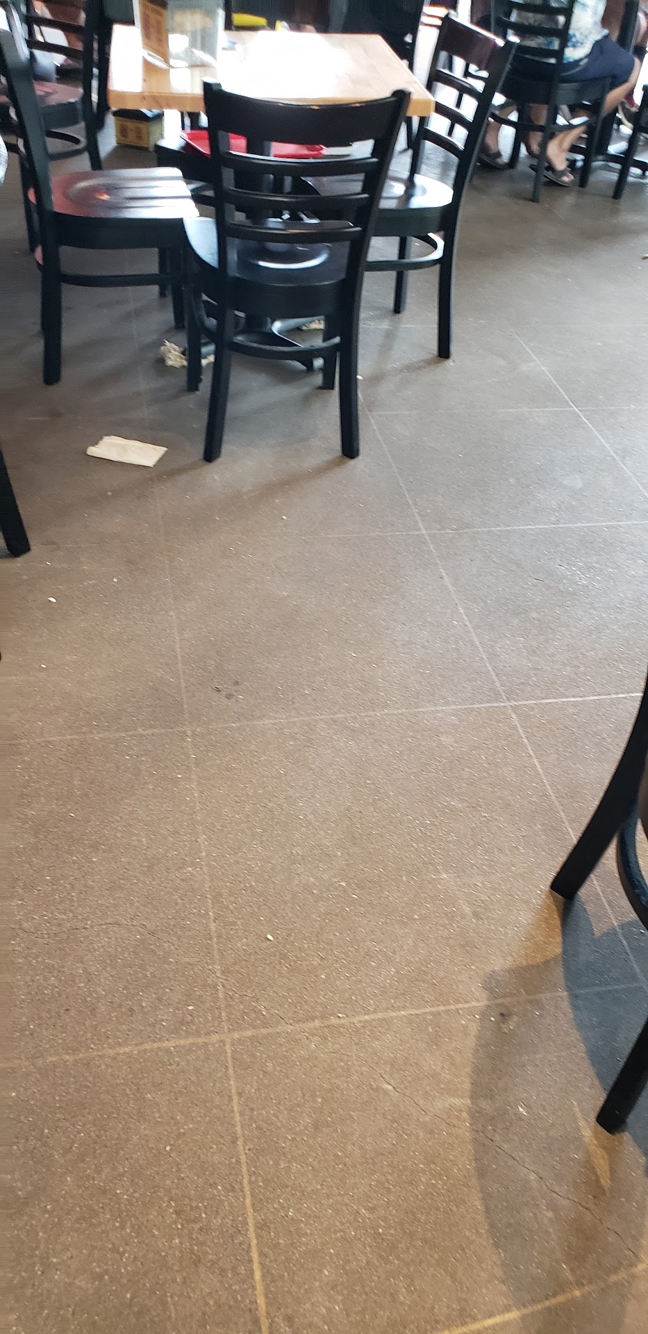 We were at this restaurant yesterday (Friday b/f Christmas) and the place was standing room only. Many work staff in the kitchen cranking out to-go orders and dining room orders. I didn't mind waiting for our 3 tacos that took almost over an hour. However, what did bother me was the big dog on a "LONG LEASH", inside the restaurant, with a girl wearing a ATX private HS shirt. At first, she was sitting down at a table with the dog. Then she got up and proceeded to greet a guy who was up at the front of the restaurant waiting on his food, along with the dog on a LONG LEASH in tow. The couple proceeded to literally grope each other up by the drink station with a whole lot of people standing around waiting for their food. Meanwhile the dog, on the LONG LEASH, was eating everything it could find on the floor. Mind you, the dog was very close to the entrance of the kitchen eating stuff off the floor. We finally found a table up at the front of the restaurant and by this time she, her friend, and her dog on the LONG LEASH had moved closer to where we were now seated. While she and her friend continued to be totally unaware of anything going on around them or what her dog was doing, the dog proceeded to come under our table and eat everything on the floor. Seriously & literally under my chair in between my feet! This was a BIG DOG on a LONG LEASH! Had I not been afraid that I would be called out for being a dog hater (WHICH I AM NOT), I would have notified management. I came very close, but the place was so packed and the Torchy's staff were so busy, I felt they had all they could handle. Not sure what the Health Department "laws" are for having a dog on a LONG LEASH inside a tiny restaurant, not wearing any kind of vest saying it was a "therapy or service dog", with a person who seemed to be pushing the envelope. My observation was that the dog was clearly not properly trained to be inside an eating establishment with people dining because he was under tables and up by the kitchen mopping up the floor...