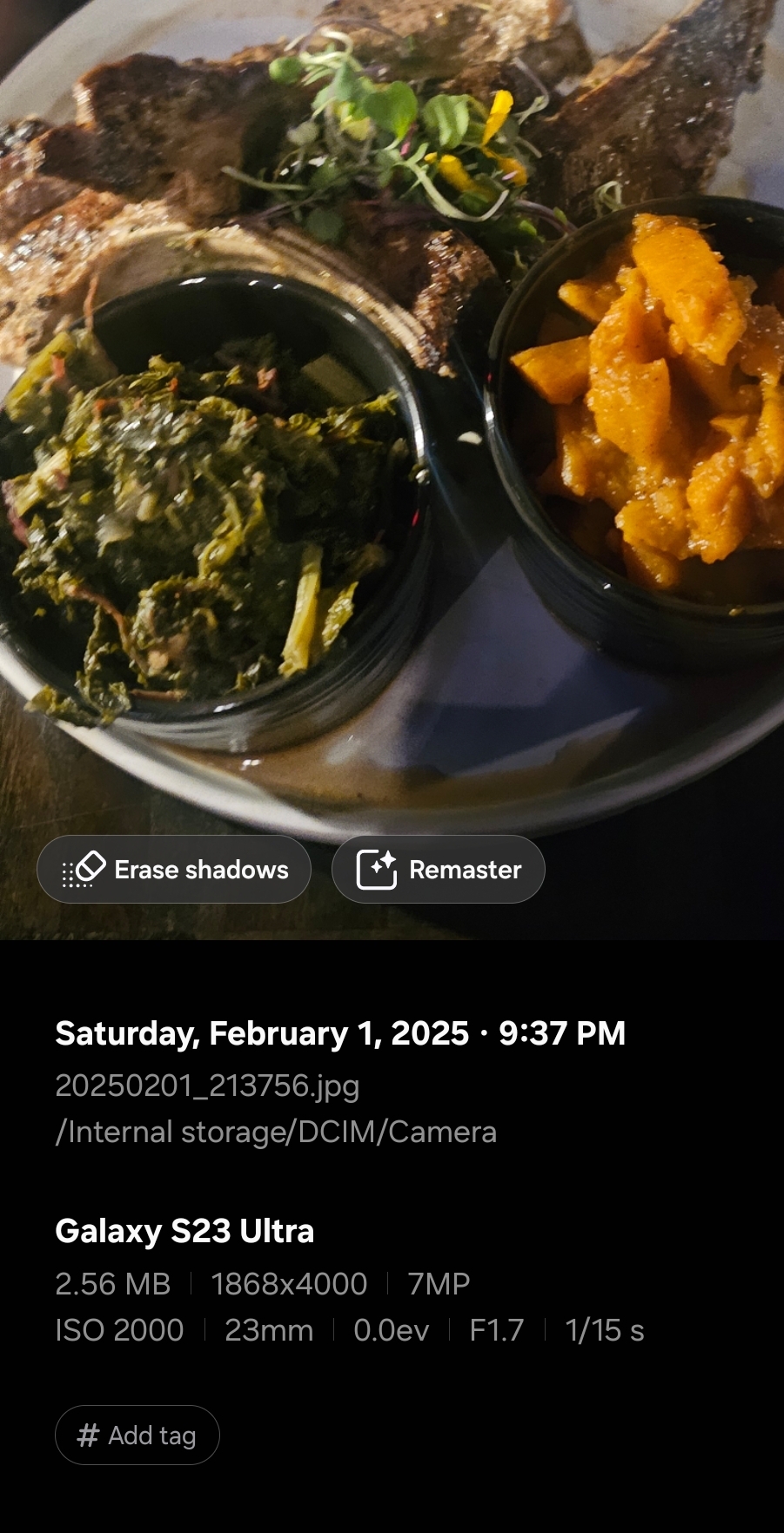 My husband ordered the lamb chop entree which comes with three lamb chops and two sides. For sides. He ordered collard greens and yams. His opinion of the lamb chops where they were a little chewy and based on the price maybe there should have been five instead of three because we all know lamb chops are pretty small. He enjoyed his yams as well as the collard greens. His overall rating was a 3 out of 5 because of the lamb chops.