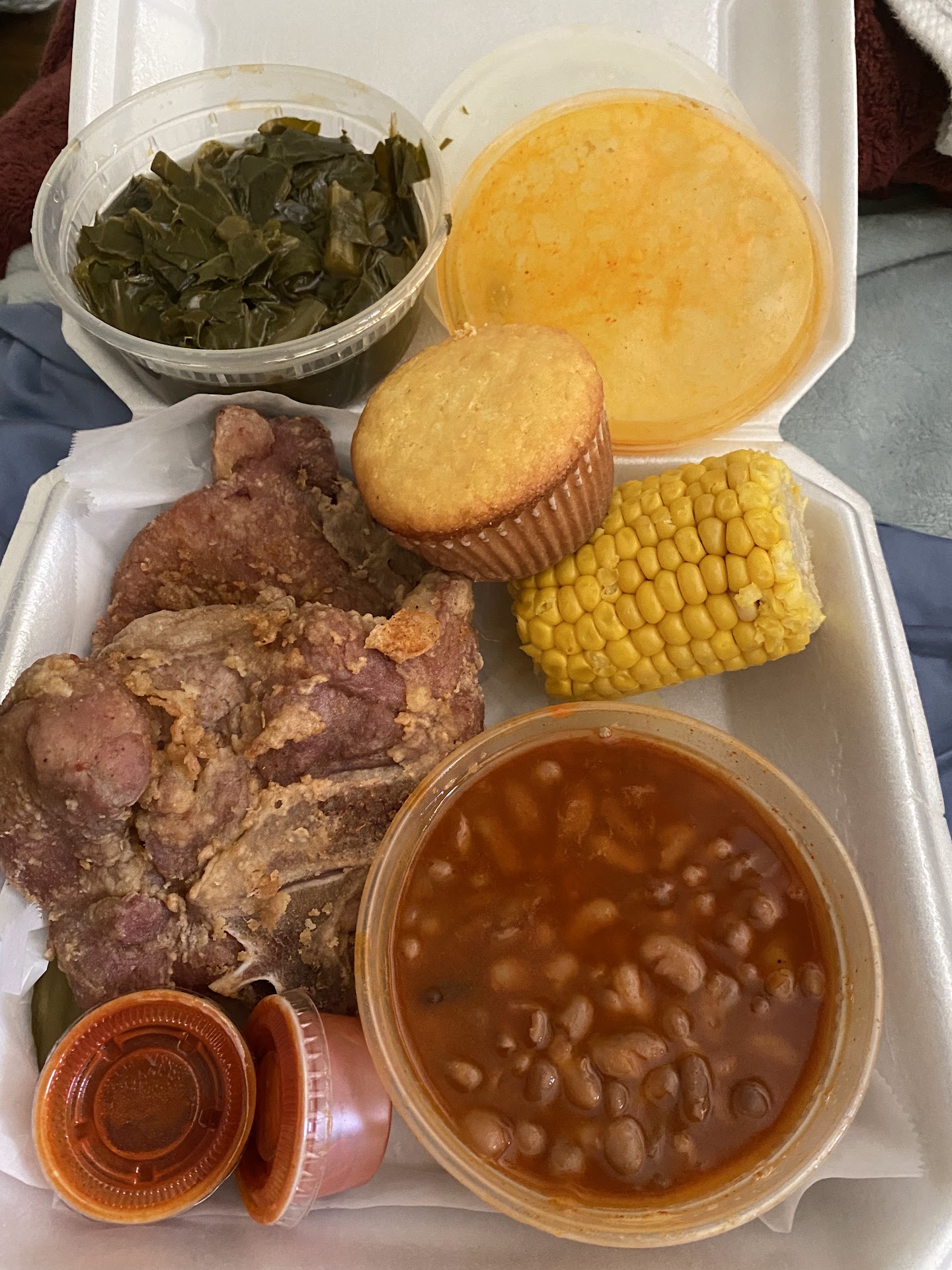 I’ve spent a lot of time in NOLA and have been craving some real Southern food. I got the fried pork chops, beans, cornbread, greens, and corn on the cob.