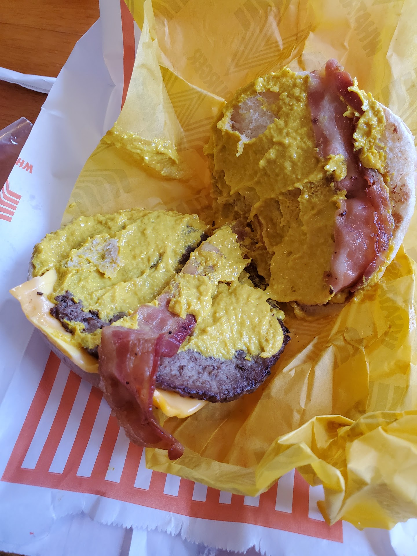 My burger was also the size of a Whataburger Junior, the patty was thin like paper and sad looking, there was bacon and cheese but none of the other standard burger toppings, but the truly noteworthy thing about it was the UNGODLY amount of mustard on it. Like, if you ordered a mustard sandwich you wouldn't have expected this much mustard. It was oozing out making a mess before I even touched anything and the moment I touched the burger there was mustard everywhere. It was literally an insane amount of mustard. The person who did this should probably seek help because they just are not a sane or reasonable person. I like mustard and I tried to clean things up and eat it but it was inedible and I threw most of it away.