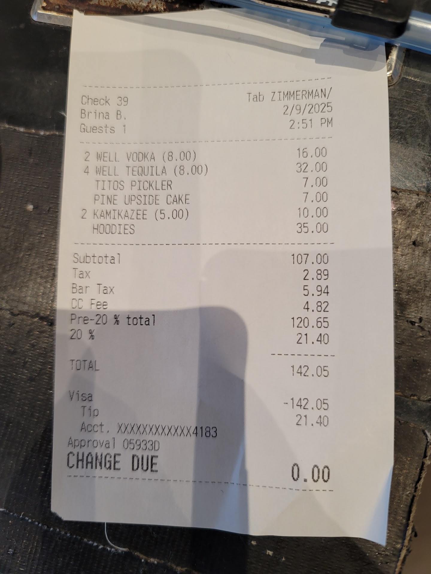 Read moreI spent some good amount of time and money here on a Sunday, with some girl friends. When I got my tab, it was well over what I expected because of their added on fee's. They charge additional fees that other bar's do not and I don't agree with paying. See one of my receipt photos for proof. White tiger management and owners charge an additional Bar Tax, CC fee, and 20% gratuity on any bill over $100. This includes any merchandise. The hoodies sign needs to be updated but they probably won't.... sign says "hoodies & crop top hoodies $30" Yet my hoodie was $35 and the manager refused to change it, nor apologize for the typo or misunderstanding. I do not recommend this place on...