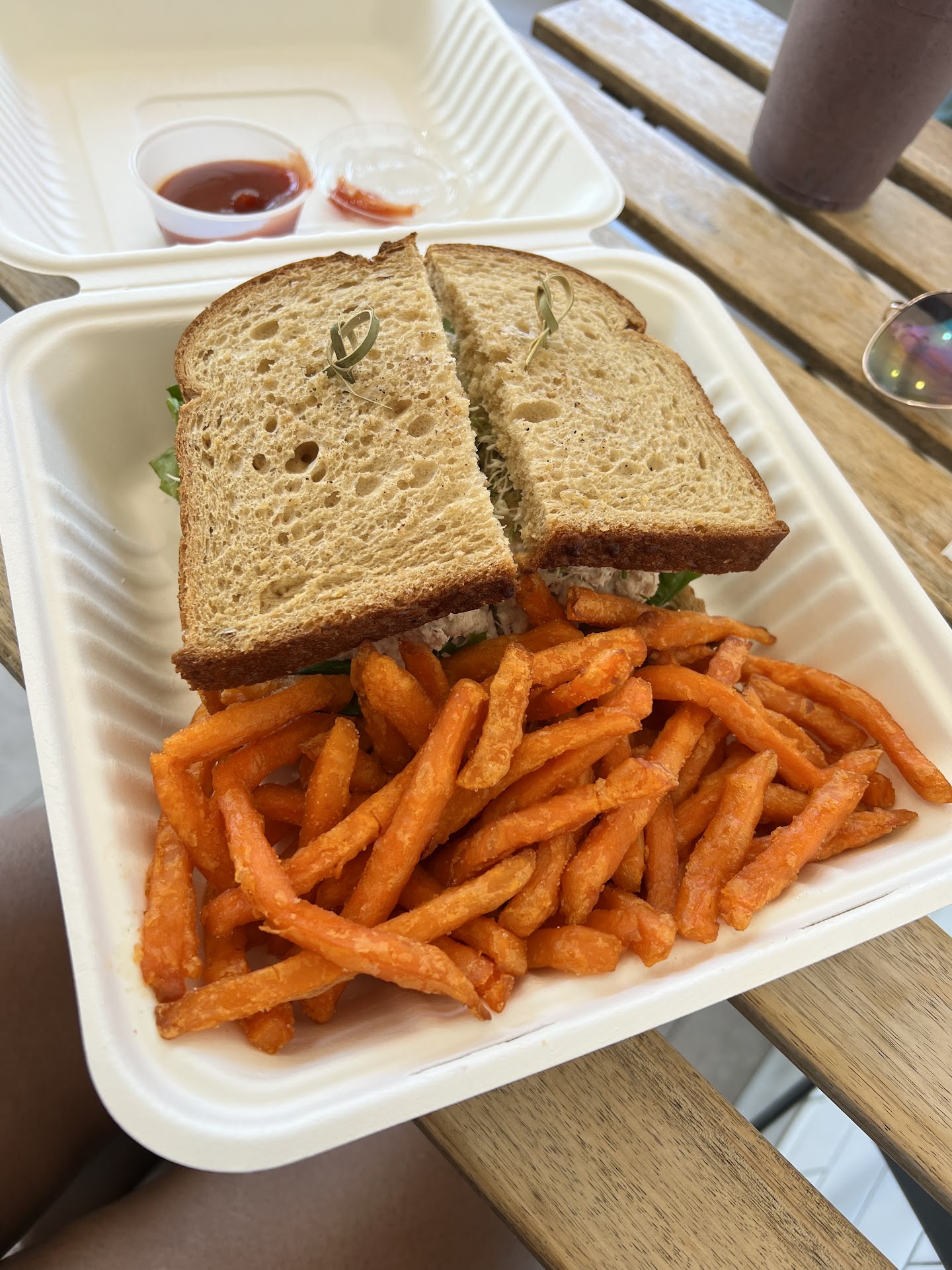 My friend and I dined here for lunch expecting a great experience considering the 4.5 star review. We were poorly mistaken. First of all, when I was ordering I tried to order a smoothie and they said they were out of ALL of them except two of them. That was the first red flag. But I order a turkey and avocado sandwich as normal, skipping the drink. We ordered and paid by 1:03pm and take a seat at a table in the outside seating area. 1:27pm comes around and we’re wondering where our food is at as it’s been almost 30mins. I walk in to check and find there is a group who ordered after us eating their food. That’s the second red flag. I ask the person taking orders for an update and she says it’s being prepared, so I go back to sit outside. 10 minutes later, the same person comes out and says they’ve run out of turkey… Could someone tell me why I was I even allowed to order a sandwich and the main part of the sandwich has completely run out??? And to find this out after over 40 minutes of waiting for it is ridiculous to say the least. But I say fine, replace it with ham. I receive my order 10 minutes later and it’s… a completely different menu item…. That costs less than the item I ordered on the menu😂😂 So NOW they have me paying more for LESS! I asked for the difference back but I should’ve just requested a refund. On top of that, the person I was with ordered right before me and didn’t even get their food before mine. So she goes in and asks for an update and it takes another 10 minutes, which means they weren’t even preparing the order before then. Crazy. And we received not a single apology from the staff of course because why should they be sorry for keeping us waiting for an extended period of time without communication, serving others before us who ordered after and, finally, serving the completely WRONG menu item… never again. The sandwich...