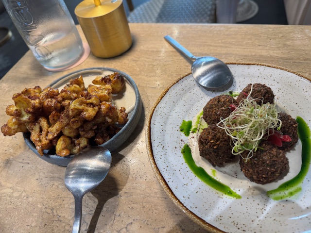 There isn't just one standout dish; everything we ate was beyond exceptional. It's hard to pick a favorite. From the crunchy cauliflower bites glazed in sticky, savory sweetness, to the Salatim trio of dips served with warm pita and Persian cucumbers dusted with sumac and salt—oh my goodness! The falafel was perfectly crisp on the outside and herbaceously fluffy on the inside. Then there was the Hamachi crudo and tuna tartar. The flavors and spices were exquisite. As if that weren't enough, we also had the burger! The frites were an added bonus, especially when dipped in the leftover Salatim trio.