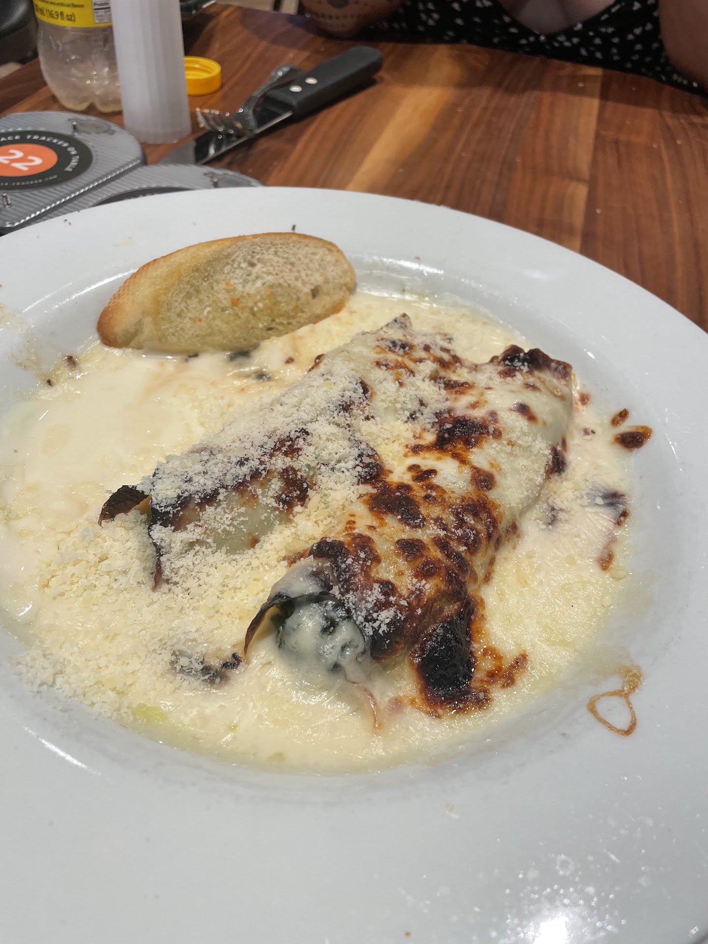 About 45 min, with us waiting and becoming impatient and hearing the kitchen staff ring the bell 3 times. we received the cannelloni. When delivered we asked for some plates as we were sharing. Never got the plates. And we asked the gentleman who delivered to check on the parrillada. The cannelloni is in no form a traditional cannelloni. Basically an Alfredo sauce topped with a bunch of cheese.