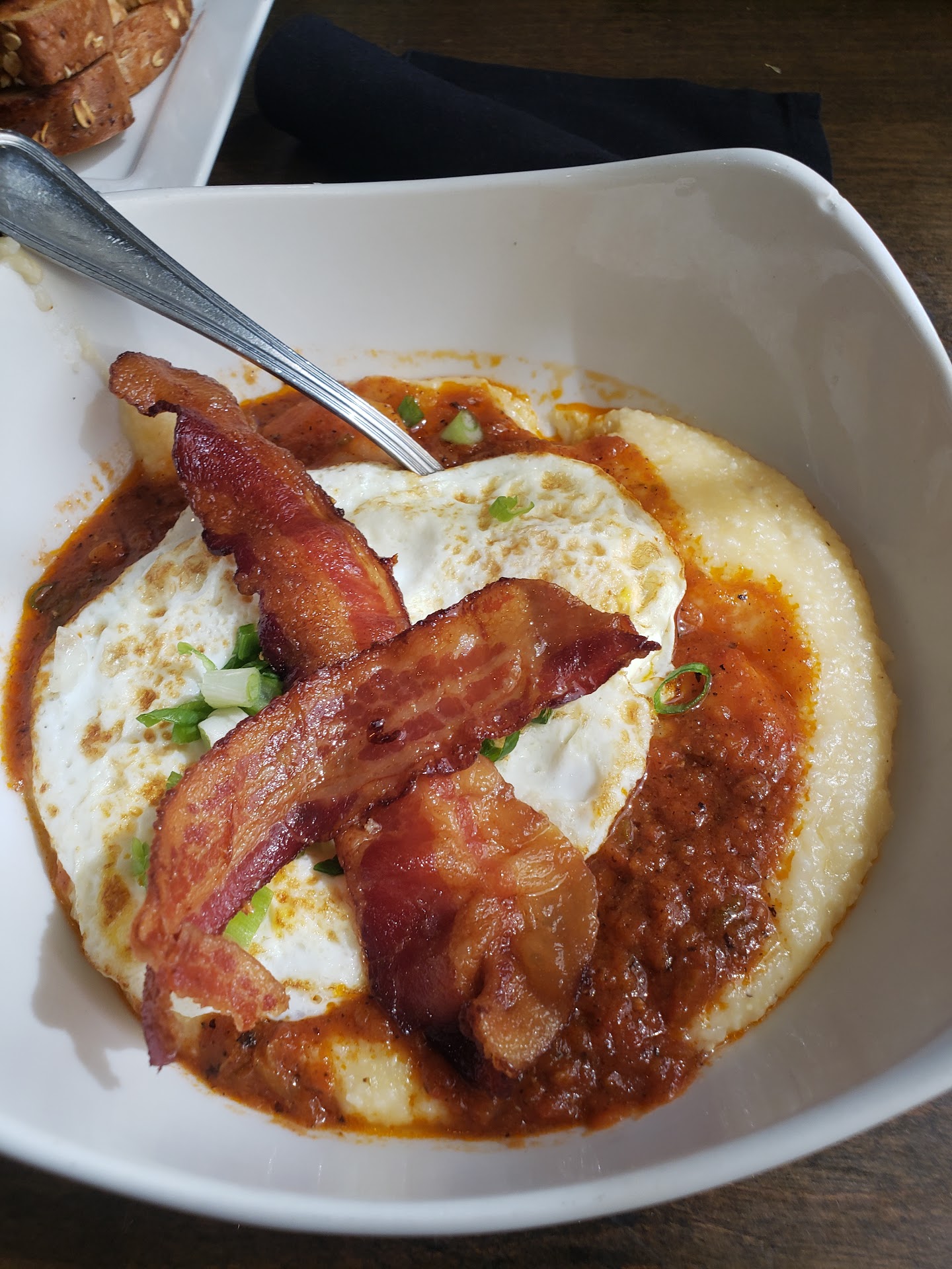 Food: I ordered the Belgian Pearl Sugar Waffles w/ crispy potatoes and peppercorn dressing. My wife had the Avacado Toast, which came with the same potatoes and dressing. I was extremely disappointed with mine. First, the small, individually wrapped butter 'cups' were still frozen and hard as a rock - and the waffles were nowhere near hot enough to even start to melt them. The waffles themselves were extremely dry (I didn't know waffles could be made that dry, but behold!). Every now and then I'd crunch down into a ball of raw sugar - ah, these must be the described 'pearls' in the dish's name. Not appealing or appetizing at all. I moved onto the potatoes - they were indeed crispy, and the parmesan cheese would have given it a delightful flavor, IF the potatoes had been fresh. They tasted like they'd been sitting around for several days and had an odd, unappealing flavor. The peppercorn dressing drizzled over the potatoes, on the other hand, was the best part of the meal! These had real potential to be fantastic - too bad.