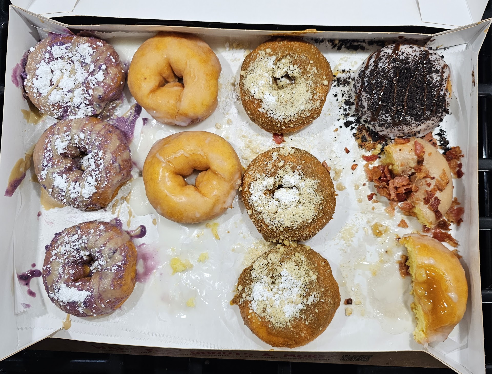 Ā Ā Ā Read moreWe were greeted by a friendly employee. My wife ordered the Bacon, Egg and Cheese breakfast sandwich, and felt that the yellow cake donut was far too sweet. Unfortunately the savory fillings did not counteract the sweetness of the donut. My son enjoyed the Oreo Cake Donuts, but felt that there was a bit too much powdered sugar, and made it a messy experience. The Pins Colada donut was delicious because the tart lemon icing with the shredded coconut made it taste like something tropical. My second donut was Bacon In The Sun. The maple coating and the smoky and crispy bacon were the best of all combinations, and I enjoyed each and every bite. Luckily the toppings I had were savory enough to counteract the sweetness of the yellow cake donut. We were not fans of the warm donuts because it made the eating...